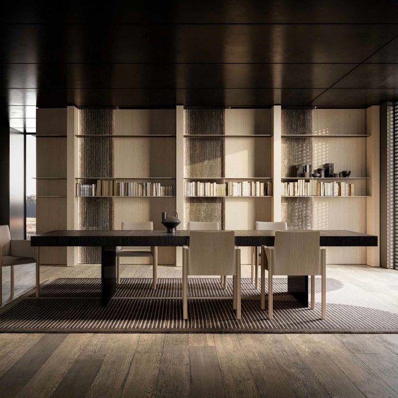 Blade Edge è la libreria di Modulnova che va oltre la funzione, trasformandosi in un racconto sensoriale fatto di materia, luce e armonia progettuale. Si inserisce nello spazio con eleganza discreta, diventando il fulcro scenografico della zona living. Lo schienale in Travertino Titanium, finitura Sense, si presenta come una superficie autentica e vibrante: la lavorazione bocciardata ne esalta la texture naturale, evocando il fascino del tempo e il valore dell’artigianalità. Un fondale materico che dialoga con il calore dei montanti in Rovere Caramel massello. Le mensole in metallo, sottili e leggere, disegnano una composizione equilibrata di pieni e vuoti, creando un ritmo visivo raffinato tra rigore geometrico e accoglienza materica. A completare il progetto, i tagli verticali di luce: dettagli luminosi che attraversano la struttura, valorizzano le superfici e guidano lo sguardo, amplificando profondità e suggestione.