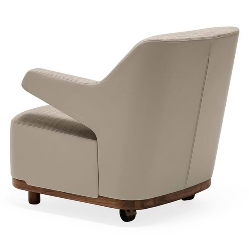 Cozy è una poltroncina di Giorgetti con struttura in multistrato di betulla e imbottitura in poliuretano espanso. La base è in noce canaletto. Rivestimento esterno in pelle e interno in tessuto categoria C.