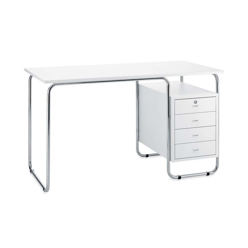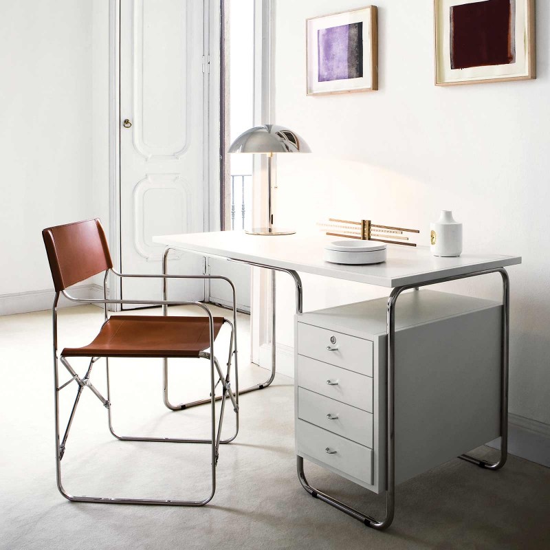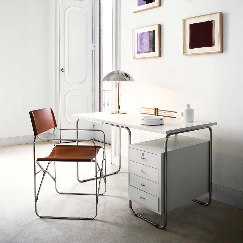 La progettazione della scrivania Comacina di Zanotta design by Piero Bottoni risale al 1930 circa e ancora oggi è uno degli oggetti di design più rappresentativi. Realizzata in struttura in tubo di acciaio inox 18/8, Comacina ha piano e cassettiera in MDF, verniciatura goffrata antigraffio nei colori bianco o nero. La cassettiera è disponibile con 4 cassetti da 10 cm l'uno, installabile sia a destra o a sinistra rispetto alla seduta. Il primo cassetto è dotato di serratura.