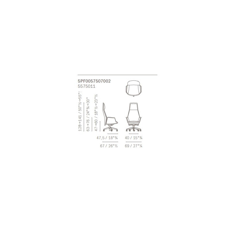 La base a cinque razze in alluminio, lucido o verniciato nero, è dotata di ruote piroettanti autofrenanti tipo “W”, adatte a tutti i tipi di pavimento. La poltrona è regolabile in altezza e girevole tramite la leva posta sotto il sedile. Le versioni President, Executive e Managerial integrano il meccanismo Syncron, che coordina movimento di sedile e schienale seguendo la postura del corpo e offre 4 posizioni di blocco.