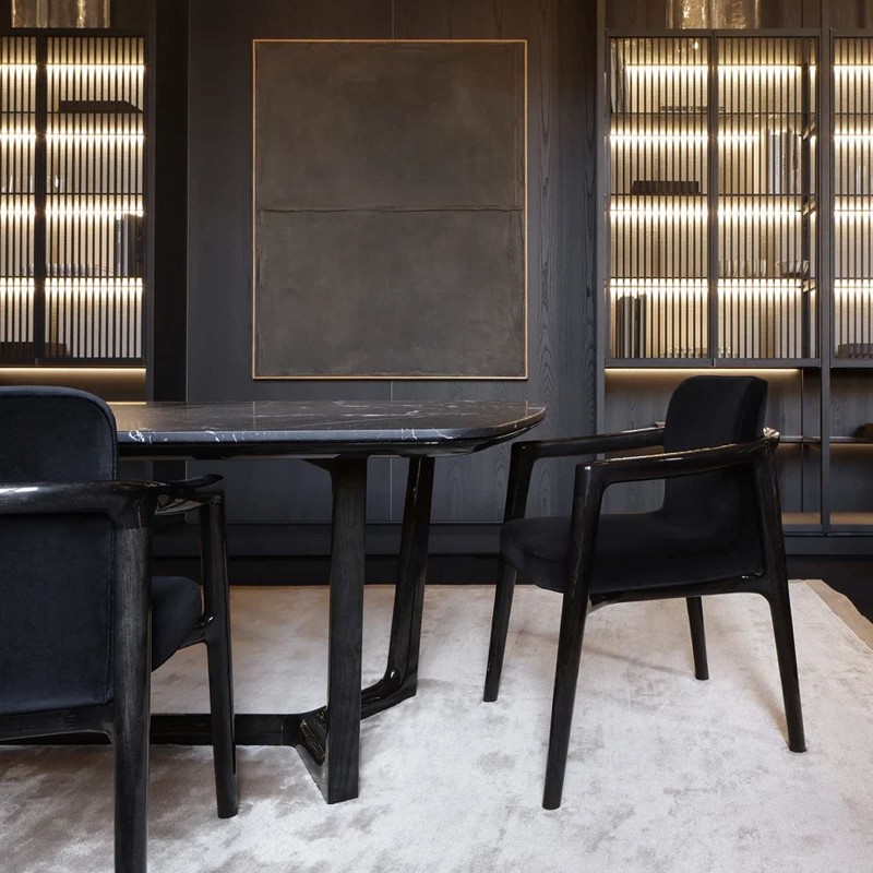 Pensata come complemento ideale del tavolo Neo Concorde, la sedia Victoria di Poliform design Emmanuel Gallina interpreta il concetto di comfort con un’estetica raffinata e contemporanea. Il progetto nasce dall’incontro tra una struttura in essenza, solida e accogliente, e una seduta morbida racchiusa come in uno scrigno. Le linee fluide e le curve leggere definiscono un design equilibrato, capace di trasmettere una sensazione di eleganza rilassata. La struttura in legno massello, disponibile in diverse finiture, ne esalta l'aspetto tattile e materico, mentre la seduta imbottita in un unico elemento garantisce continuità visiva e massimo comfort. Rivestimento sfoderabile in tessuto o pelle.
