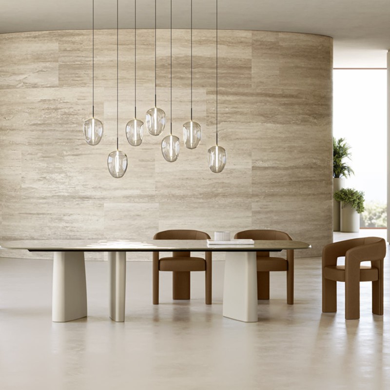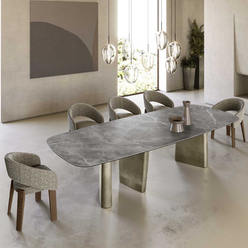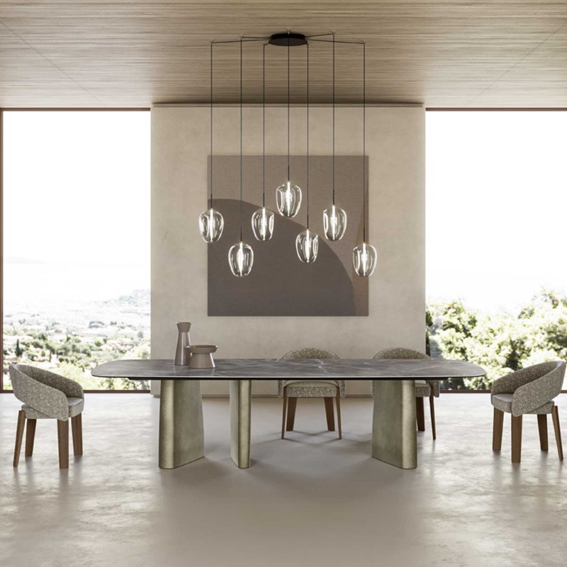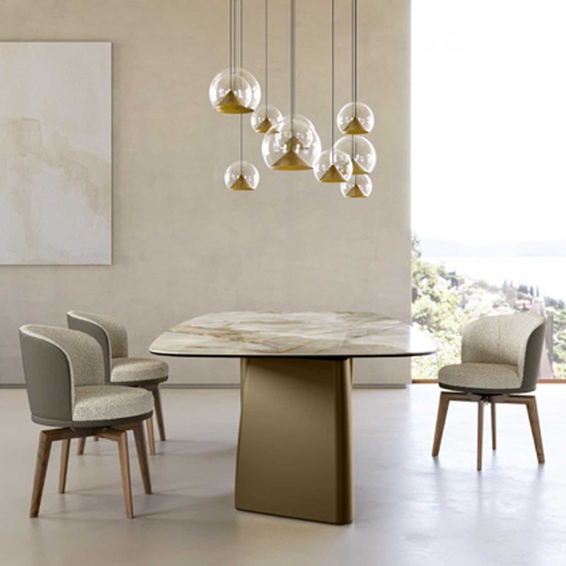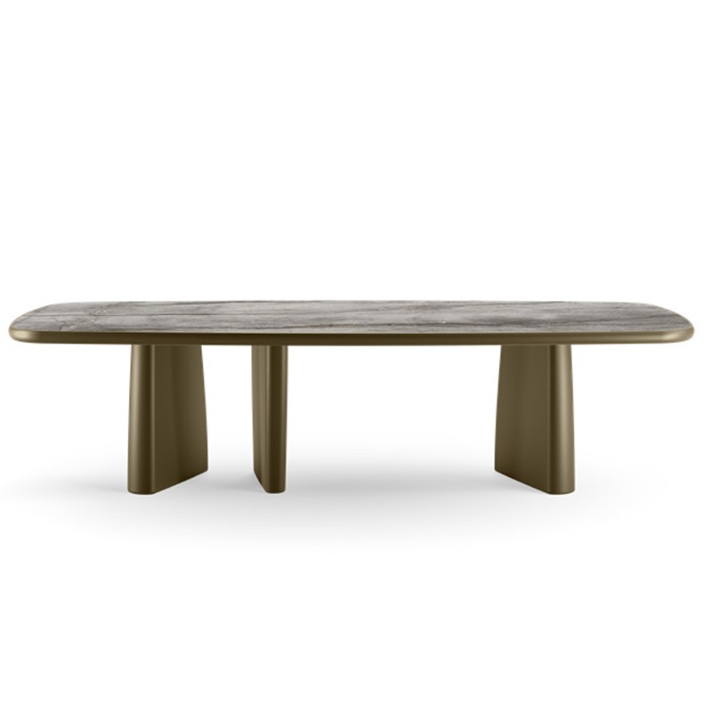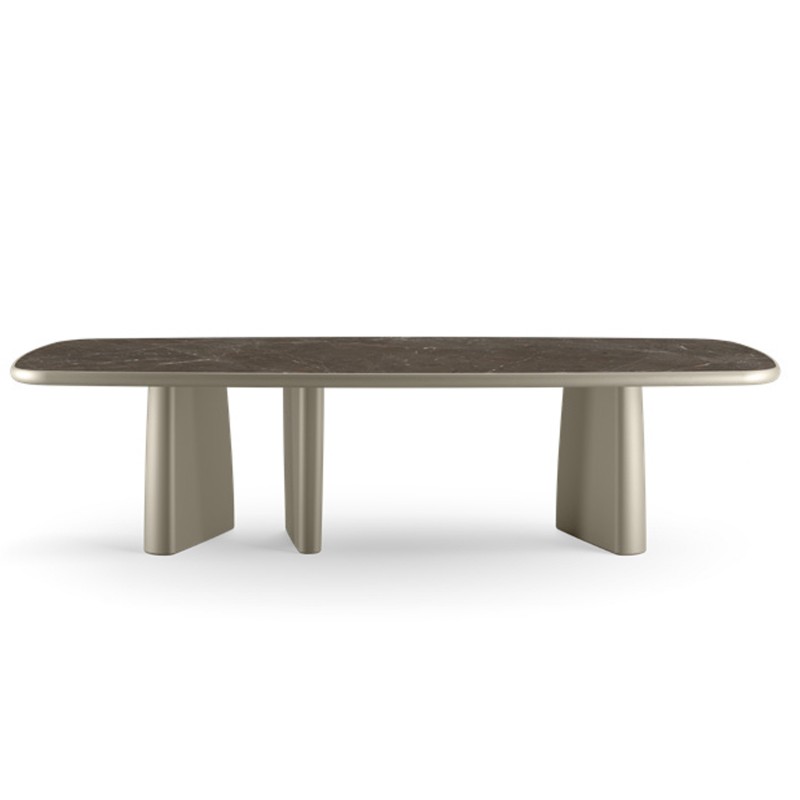Albert di Eforma è il nuovo tavolo presentato al Salone del Mobile 2025 che spicca per il forte impatto visivo determinato dalla combinazione del piano sagomato o rettangolare da personalizzare con superfici in cristallo, legno, ceramica o marmo e dalla base composta da una serie di elementi in legno laccato dalle forme arrotondate che variano in numero e posizione in base alla dimensione del top selezionata. La particolarità delle gambe è data anche dalle raffinate finiture laccate come il bronzo, l'avorio, il platino spazzolato.