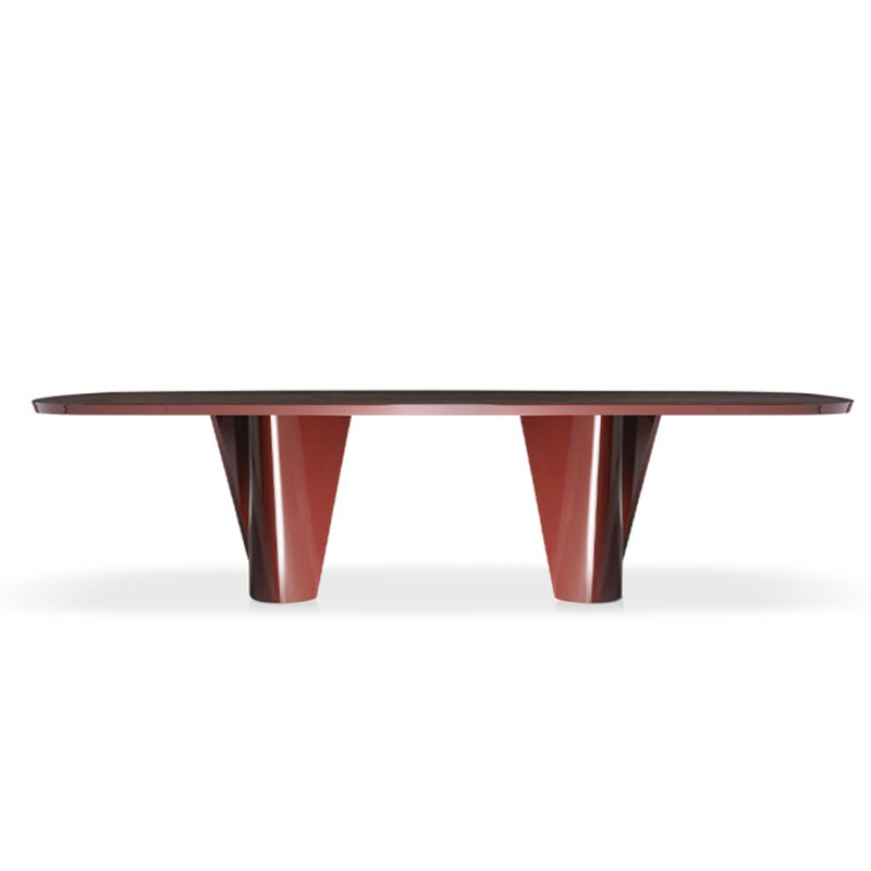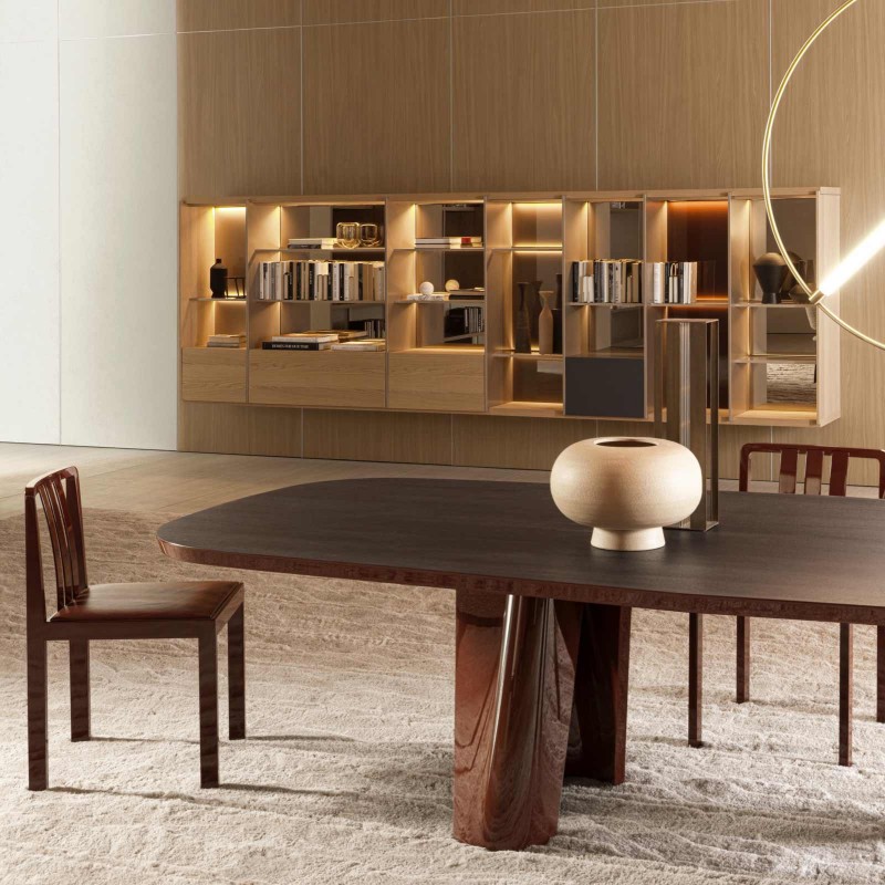 Lise è il nuovo tavolo di Molteni&C design by Christophe Delcourt presentato durante la Milano Design Week 2025. Dall'allure decisamente scultorea, Lise sintetizza funzione ed estetica in un dining table dai volumi organici e armoniosi. Una summa di dettagli che celano un accurato pensiero progettuale sia nel top sia nella base. Proprio questa spicca infatti perché connotata da due strutture ricurve contrapposte che si insinuano una nell'altra slanciate verso l'alto. In poliuretano rigido, possono essere in laccato lucido in combinazione con il piano in legno con bordo laccato o rivestite da una lastra in acciaio lucido in combinazione con il top in marmo. Ad impreziosire il top vi è il bordo nella stessa finitura della base che restituisce al tavolo la percezione di continuità visiva. Qui è proposto nella versione con piano in essenza, rovere caffè o rovere nero, in abbinamento ai laccati lucidi.