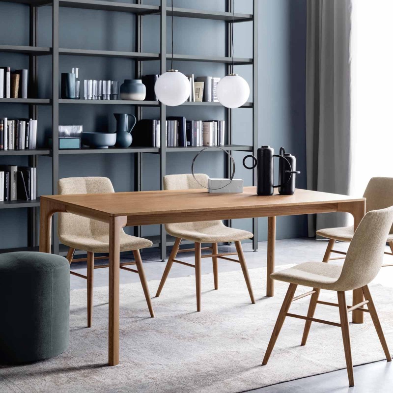 Archetipo del tavolo a quattro gambe, Level è il tavolo allungabile di Novamobili che smorza il rigore dei volumi puri attraverso un leggero arrotondamento degli angoli del piano e delle gambe con sezione a L. Level si estende fino a 247,3 cm per raccogliere 10 ospiti. Le allunghe disponibili sono 2 da 40 cm ognuna. Il minimalismo del tavolo Level si "scalda" con le finiture disponibili degli impiallacciati: rovere miele, rovere terra e rovere grigio.