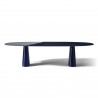 La serie Treflo viene proposta nella versione con piano rotondo e basamento centrale o ovale con due basi. Qui lo proponiamo con il piano in vetro.