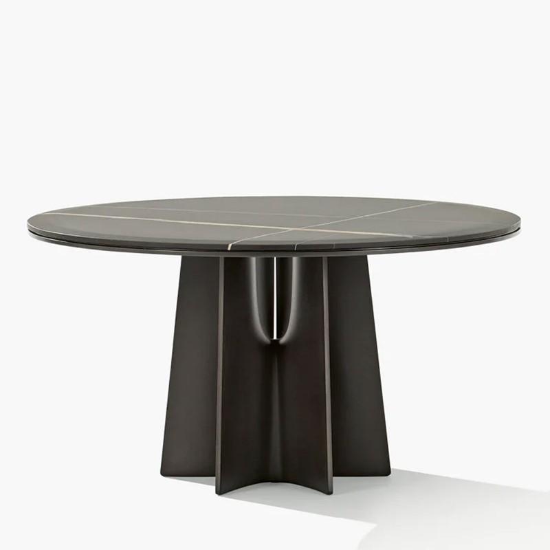 Vortice è un tavolo scultoreo ma leggero. Pensato per spazi contenuti come quelli della cucina, racchiude in sé un’innata eleganza e uno spirito sofisticato che rispecchia le esigenze del dining contemporaneo. Per la base centrale in metallo è stata scelta una finitura dall’effetto artigianale, che valorizza l’autenticità del materiale soprattutto nell’abbinamento con i piani in marmo o in essenza, sempre con bordi smussati