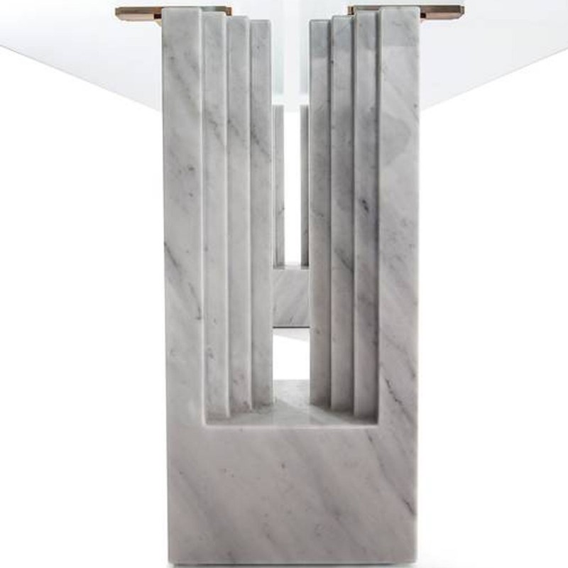 Delfi è il tavolo rieditato da Cassina che fa parte della collezione Ultrarazionale lanciata nel 1968, composta da pezzi scultorei realizzati da Carlo Scarpa prestando estrema attenzione ai dettagli, alle lavorazioni e alla selezione dei materiali. Il tavolo è una riprogettazione di un modello razionalista creato da Marcel Bauer negli anni ’30 per la casa bolognese di Dino Gavina. Alla fine degli anni ’60 Scarpa iniziò a rivalutare la concezione originaria apportando alcune variazioni condivise con l’autore. In seguito, nel 2009, Tobia Scarpa propose una nuova variante con piano in cristallo che metteva in vista i raffinati sostegni in ottone e le scanalature delle basi in marmo facendo risaltare l’eleganza delle forme.