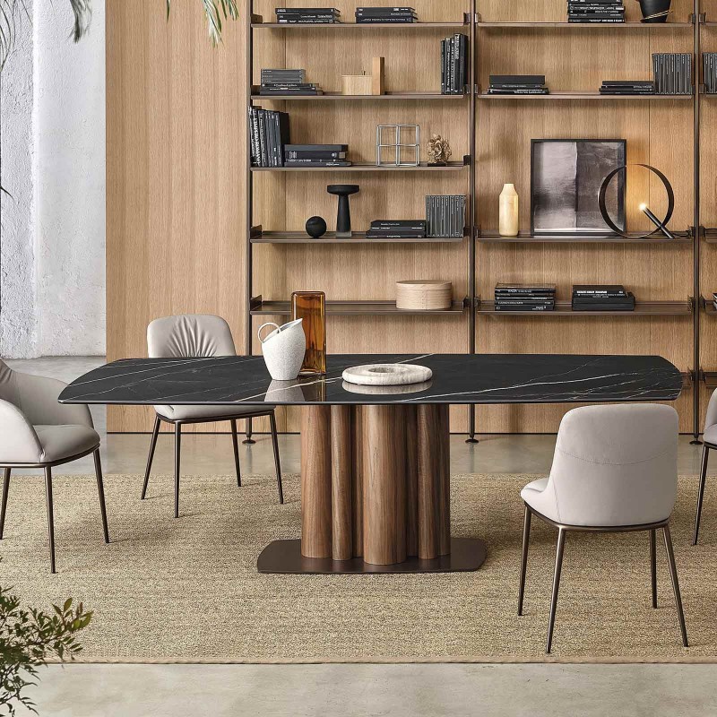 Tower è il tavolo firmato Riflessi che spicca per il suo basamento scultoreo realizzato da una serie di colonne cilindriche in metallo. Il piano è in ceramica bisellata stratificata su vetro, disponibile in un'ampia gamma di finiture. La base può essere verniciata in vari colori o rivestita in legno noce canaletto o rovere coke, così come anche la piastra personalizzabile nei colori: grafite, bronzo, chAmpagne perlato.