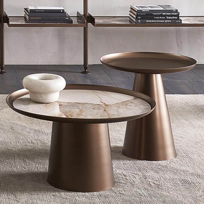 Ring è il nuovo tavolino da caffè di Riflessi dallo spirito scultoreo, in grado di impreziosire la zona living. Nella versione con piano coordinato alla struttura in metallo verniciato bronzo, Ring è un elemento scultoreo monolitico. Nella versione con piano in ceramica in appoggio, disponibile in molteplici superfici, Ring diventa ancora più prezioso con un top che replica i materiali più nobili in natura come il marmo, "abbracciato" dalla cornice in metallo della struttura.