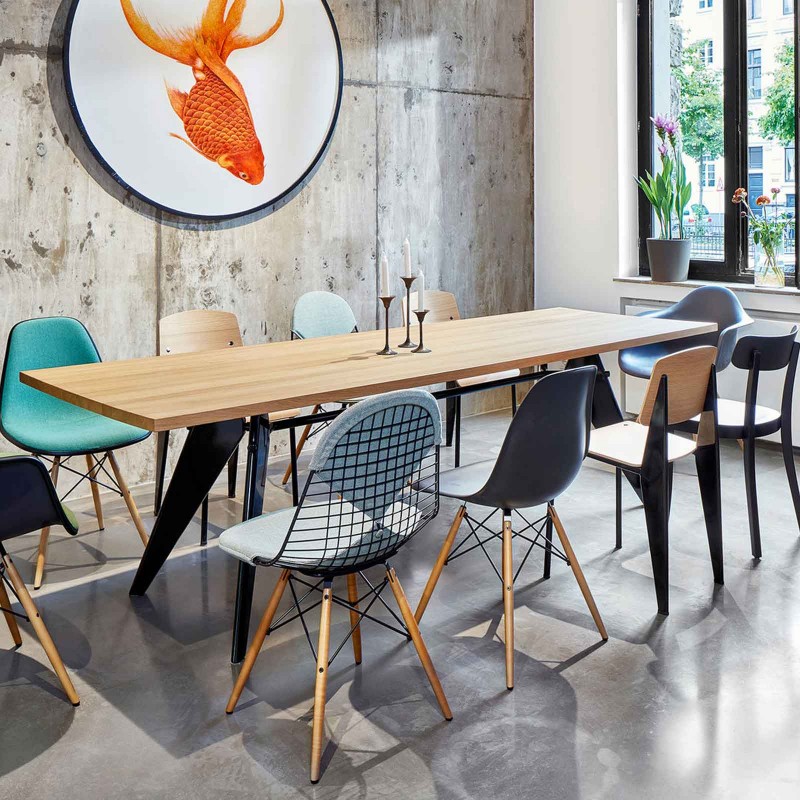 EM, il tavolo di Vitra ideato da Jean Prouvè che aderisce ai principi strutturali illustrando, grazie al suo aspetto estetico, il flusso di forze e sollecitazioni nella sua costruzione. Il piano del tavolo di Vitra è disponibile in una gamma di finiture in legno massello pregiato o laminato HPL o in rovere impiallacciato. EM, inoltre, esiste nella versione da 200 o 400 cm per soddisfare ogni esigenza e adattarsi a qualsiasi sala da pranzo. Scegli la combinazione che preferisci per il tavolo EM di Vitra e richiedi senza impegno un preventivo contattando il servizio clienti di Allmyhome: info@allmyhome.com - 0732 959436.