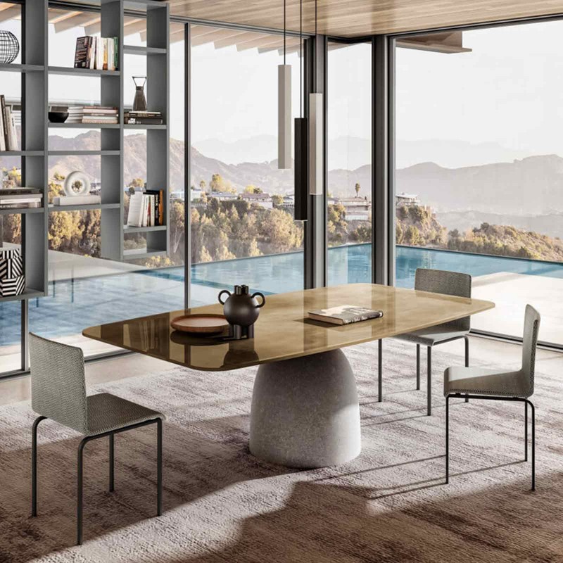 Il tavolo Janeiro di Lago è il connubio perfetto tra solidità della base e leggerezza del top. Progettato da Bartoli Design nel 2019, Janeiro è caratterizzato da una base in acciaio ricoperta da un blocco di cemento, naturale o antracite, che ha la forma ispirata al noto promontorio brasiliano "Pan di Zucchero" di Rio de Janeiro. Due solidi a forma di cupola sorreggono così il piano del tavolo in vetro disponibile anche nella forma rettangolare o circolare in una straordinaria varietà di finiture.