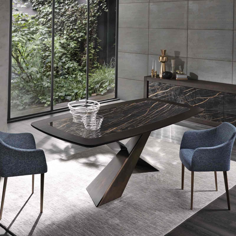 Living è un tavolo di Riflessi contemporaneamente massiccio e glamour. Le gambe in acciaio verniciato sono inclinate e sovrapposte in maniera asimmetrica; l'intreccio del basamento rende il tavolo unico e sofisticato.Il piano è in rovere.