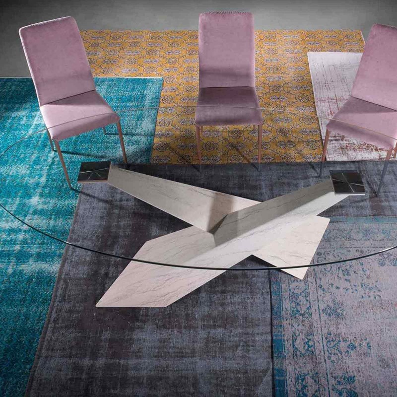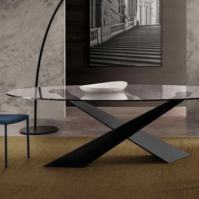 Living è un tavolo da pranzo di Riflessi di grande presenza e contemporaneamente molto glamour. Le gambe sono inclinate e sovrapposte in maniera asimmetrica; il loro intreccio rende il tavolo unico e sofisticato. Il piano è in cristallo temperato.