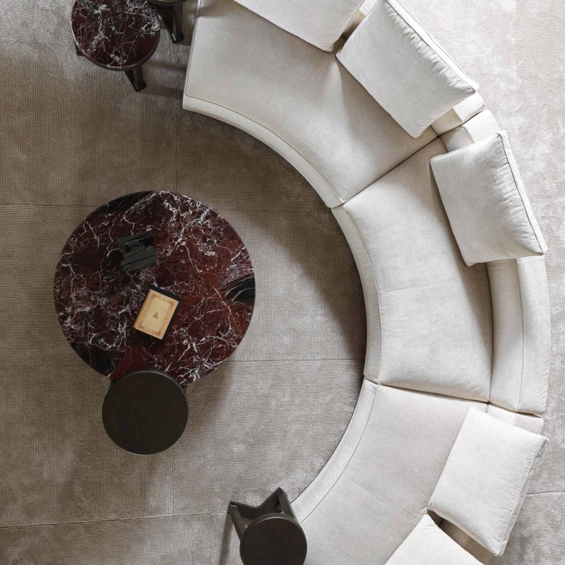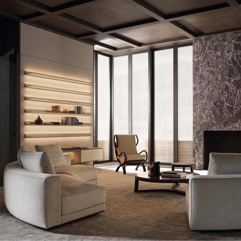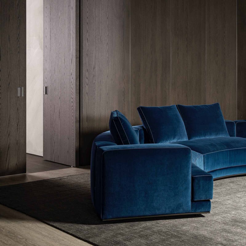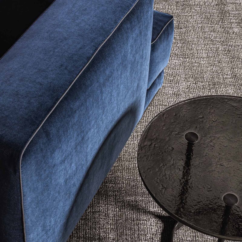 Augusto è caratterizzato dal telaio in legno massello e l'imbottitura in schiuma ad alta densità e morbidi cuscini di seduta in fibra di poliestere PET riciclata. La base in metallo con i piedini in alluminio con puntali antiscivolo, assicura durata nel tempo in linea con l'etica eco-consapevole di Molteni&C.