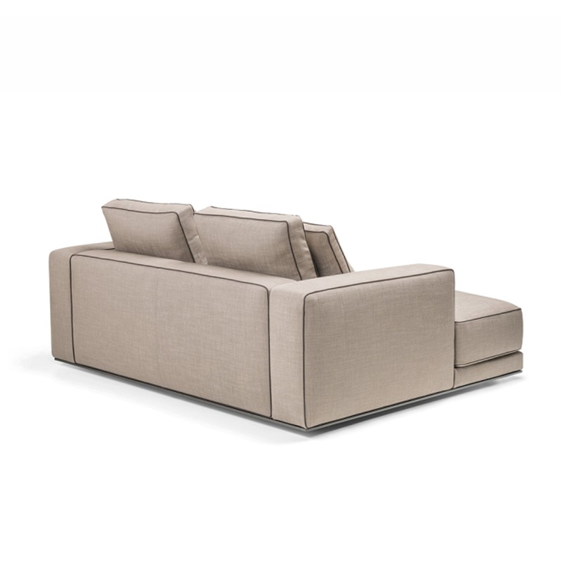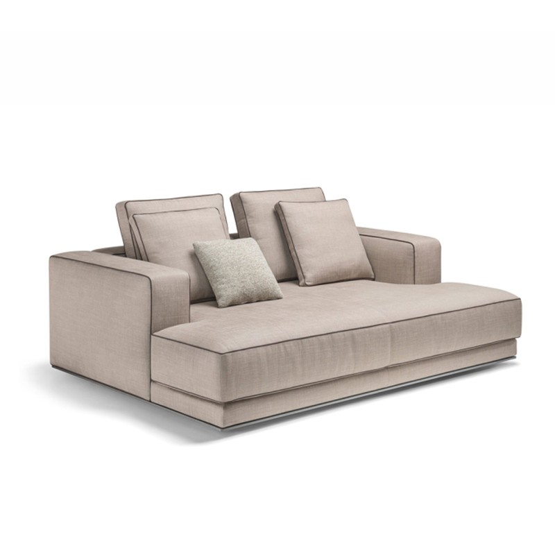 Augusto è caratterizzato dal telaio in legno massello e l'imbottitura in schiuma ad alta densità e morbidi cuscini di seduta in fibra di poliestere PET riciclata. La base in metallo con i piedini in alluminio con puntali antiscivolo, assicura durata nel tempo in linea con l'etica eco-consapevole di Molteni&C.