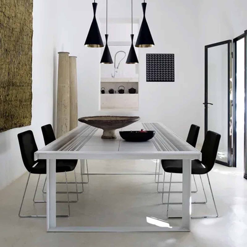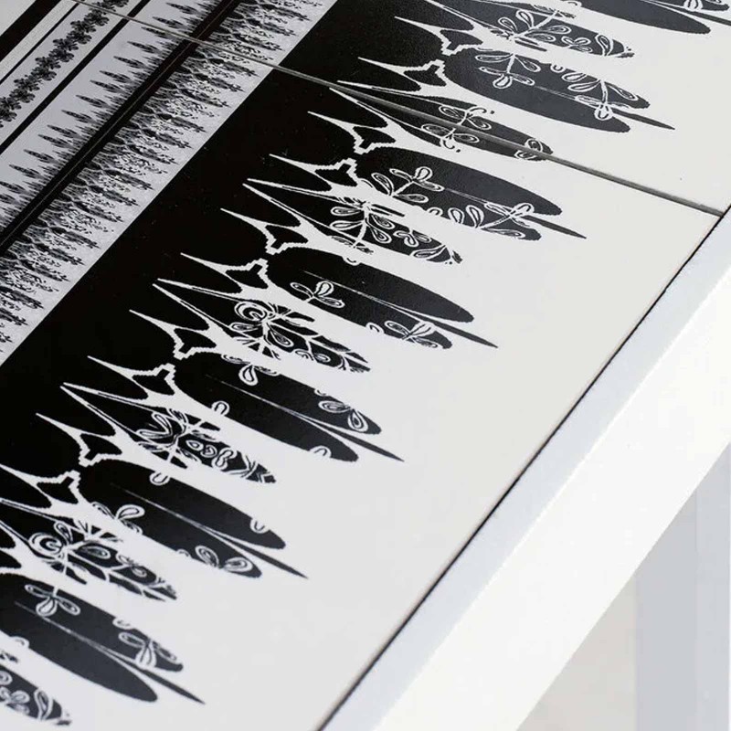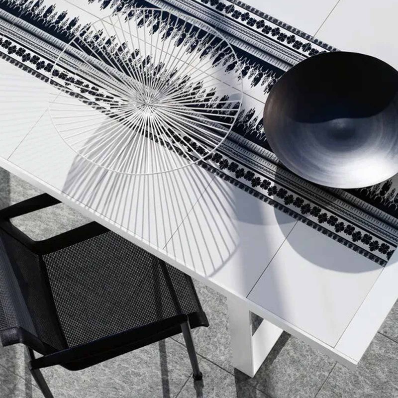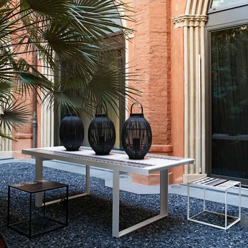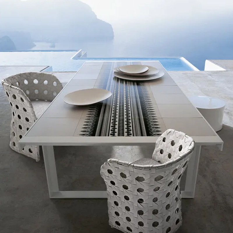 Canasta è il tavolo rettangolare per esterni di B&B Italia Outdoor proposto in due dimensioni. La struttura è in alluminio verniciato a polvere poliestere, perfettamente resistente agli agenti atmosferici. La particolarità è nel piano, rivestito in gres porcellanato bianco con decori ornamentali neri.