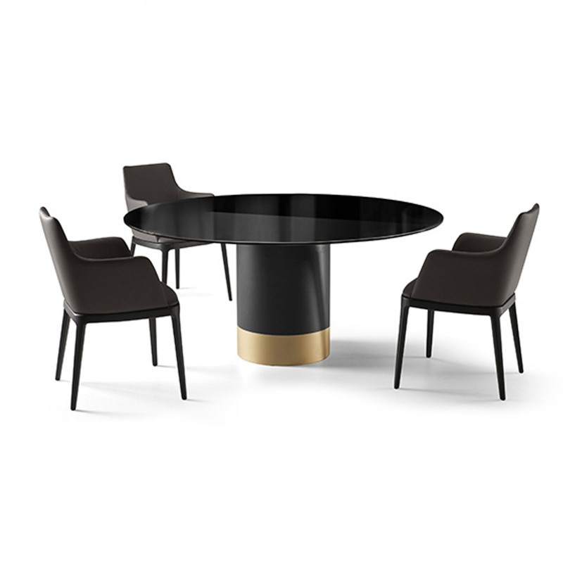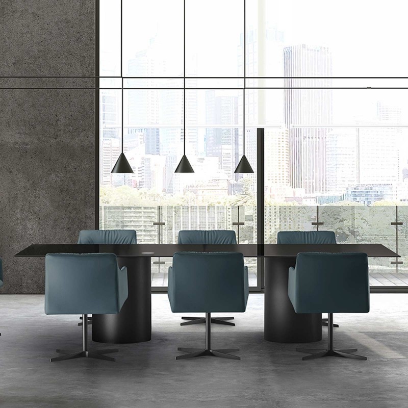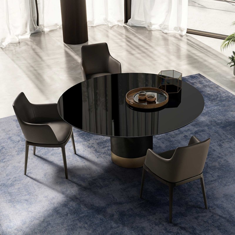 Cilindro è un tavolo caratterizzato da una base in metallo bicolore con piano in cristallo temperato verniciato nero lucido con spessore 12 mm. I piani 240x120, 300x120 e 320 x130 hanno spessore 15 mm. Cilindro è perfetto per arredare con stile contemporaneo e luxury.
