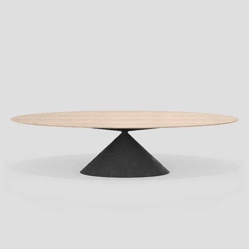 Clay Maxi di Desalto è la novità del Salone del Mobile.Milano 2023 e, come indica il nome, raggiunge dimensioni notevoli con un piano ovale di 3,5 metri. Clay Maxi osa sfidare ulteriormente la gravità in un equilibrio che sembrerebbe instabile dato dai due coni che si incontrano ai propri vertici e fungono da base e top, rendendo questo tavolo una scultura iconica ormai.