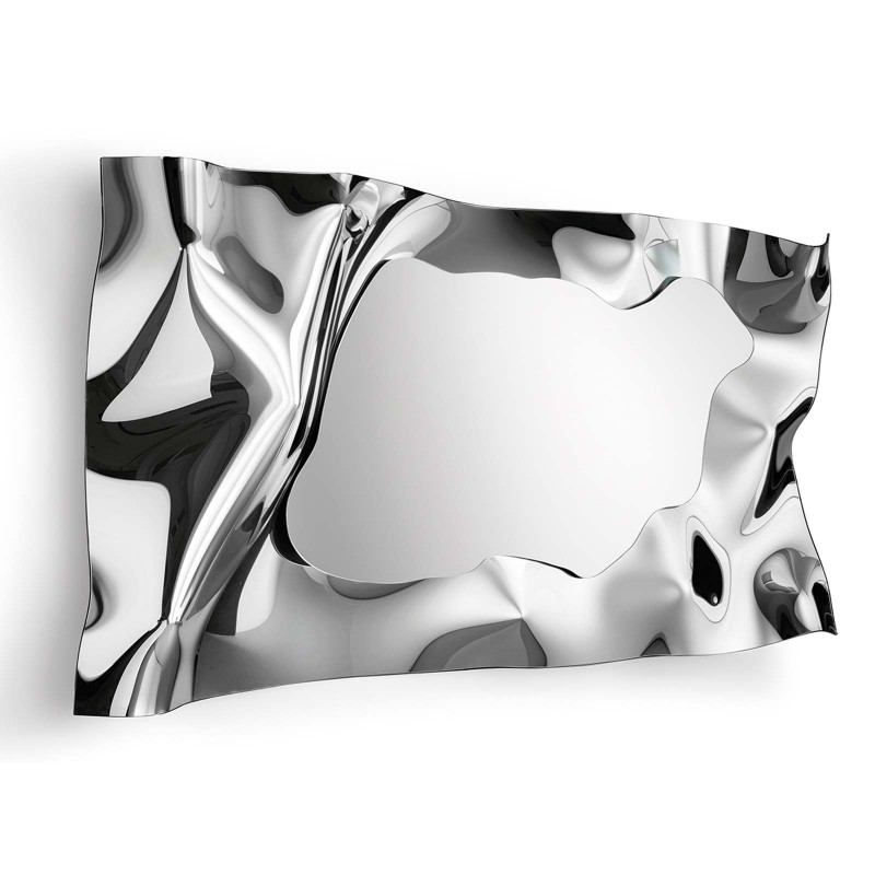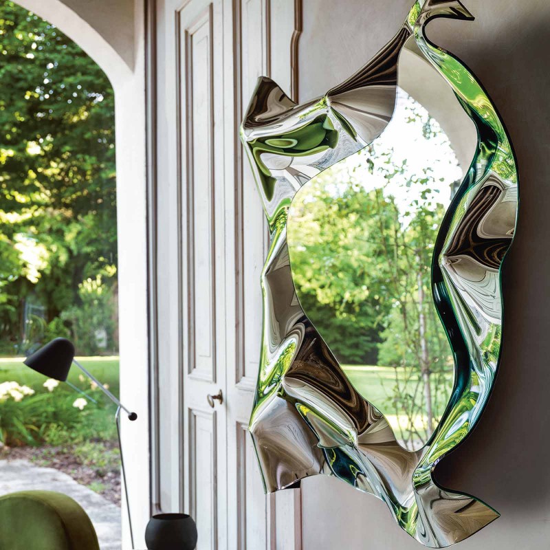 Specchio da parete in vetro fuso da 6 mm retro argentato, specchio piano da 5 mm. Telaio posteriore in metallo verniciato. Possibilità di appendimento in diverse posizioni.