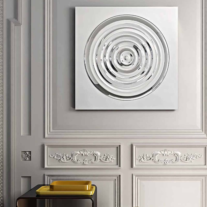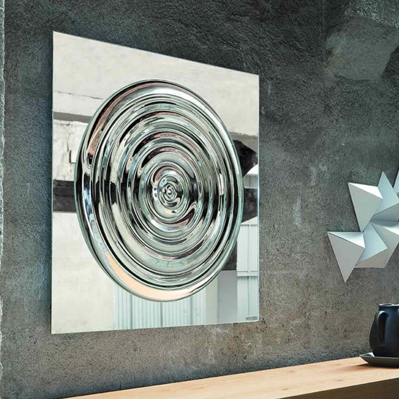 Specchio con fusione centrale sagomata. Lo specchio murale Drop diventa elemento decorativo grazie alla superficie che si trasforma in un vibrante motivo a cerchi concentrici.