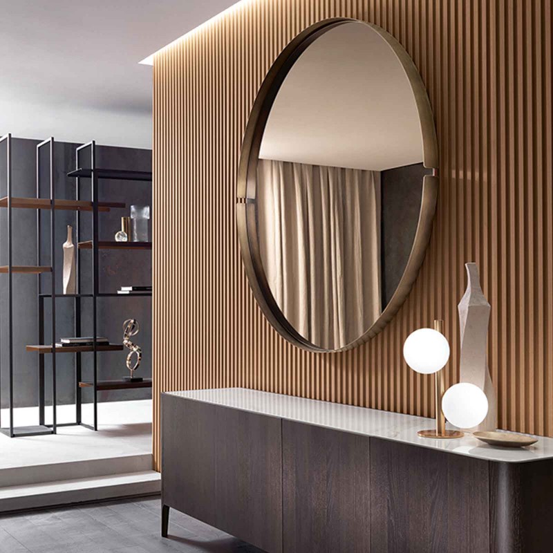 Lo specchio Omega di Riflessi è l'esempio di come il dettaglio fa la differenza. La cornice, infatti, è composta da un sottile profilo in ottone spazzolato a mano che disegna due semicerchi tenuti insieme dallo specchio centrale bronzato. Un cerchio perfetto e lineare, che caratterizza con semplicità elegante ogni spazio.
