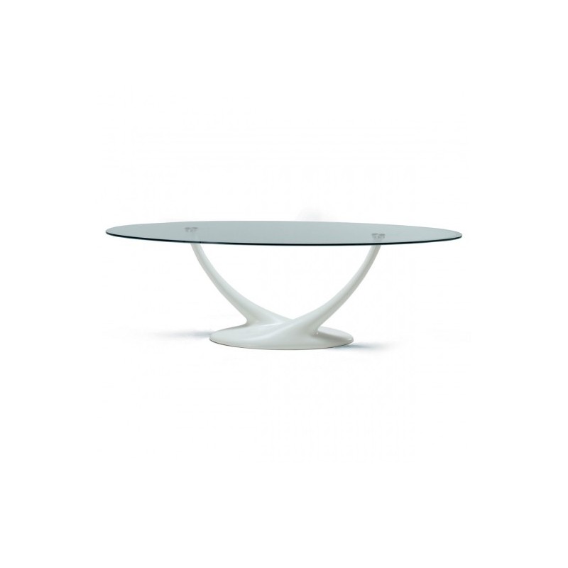Il tavolo Coral di Cattelan Italia ha la base in poliuretano verniciato bianco ed il piano con piastre in cristallo trasparente, di 15 mm.