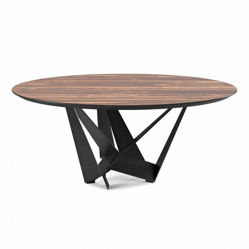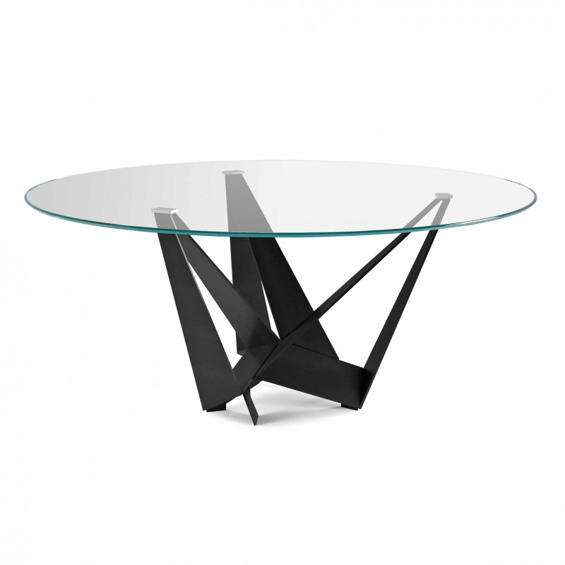 Il Tavolo Skorpio Round ha base in acciaio goffrato bianco, nero o graphite ed il piano in cristallo trasparente.