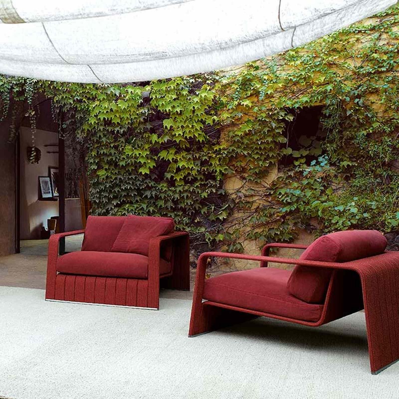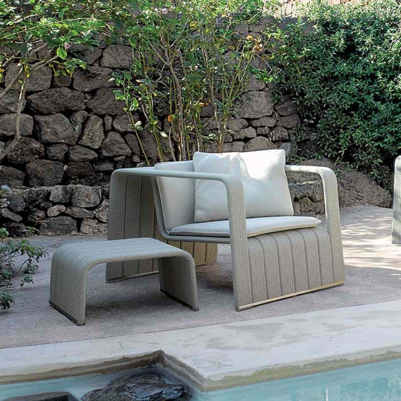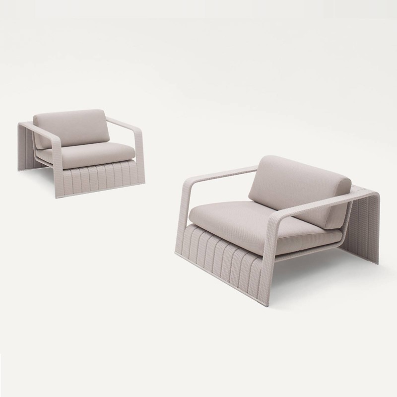La poltrona Frame di Paola Lenti è un'originale seduta da esterni contraddistinta da un design squadrato e rigoroso ingentilito dal rivestimento disponibile in vari filati del brand. La struttura è in alluminio e parti in vista in acciaio inox AISI 316.