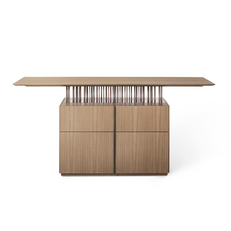 La cassettiera G-Code di Giorgetti firmata da Dante O. Benini e Luca Gonzo è una novità 2023 dal forte impatto scenografico. L'elemento che dona unicità a G-Code è la struttura metallica realizzata con 49 cilindri in tre differenti dimensioni e finiture. L'ispirazione di questo reticolo portante che unisce piano e contenitore sottostante nasce, come ha dichiarato Benini, da un viaggio negli Stati Uniti dall'osservazione della spazzola del kit di cortesia in aereo, immaginando così che la trama dell'oggetto potesse diventare un elemento architettonico con la funzione di trave per un grande piano.