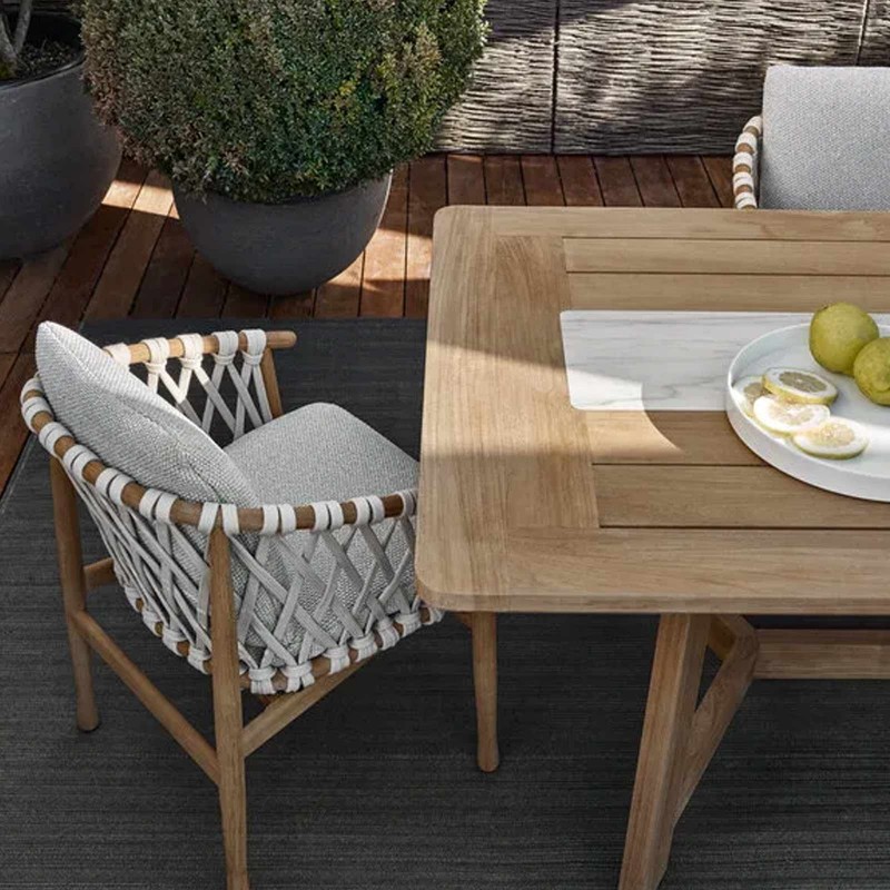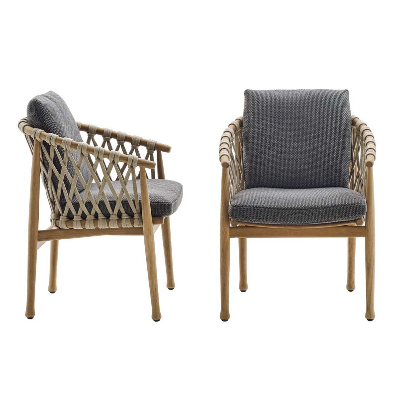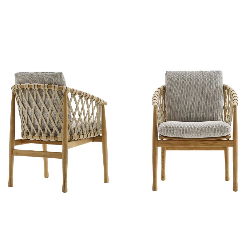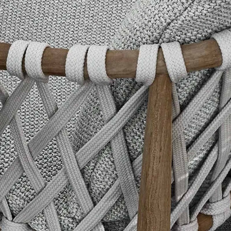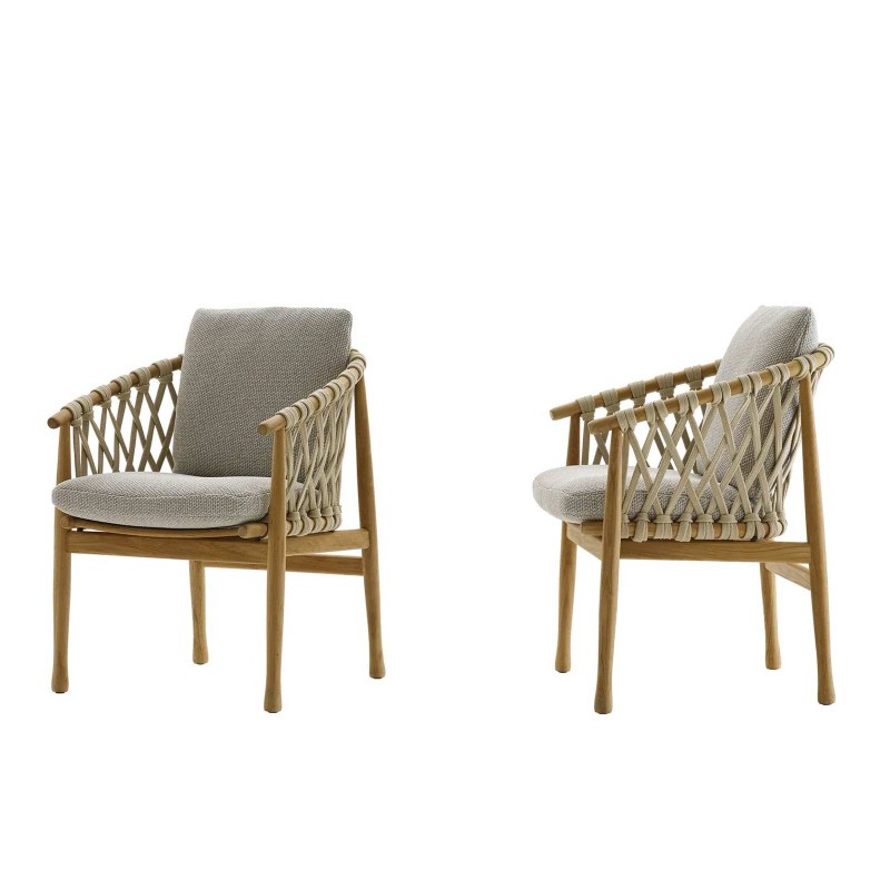 Ginestra di B&B Italia Outdoor è una sedia dalla solida struttura in teak naturale progettata da Antonio Citterio. Le linee, sinuose e rassicuranti, richiamano uno stile nordico. Ginestra è impreziosita da un intreccio di nastri in tessuto sintetico dal colore neutro che non teme le intemperie. Ginestra garantisce comfort grazie ad uno schienale e sedile rivestiti con i cuscini disponibili nei rivestimenti della gamma B&B Italia.