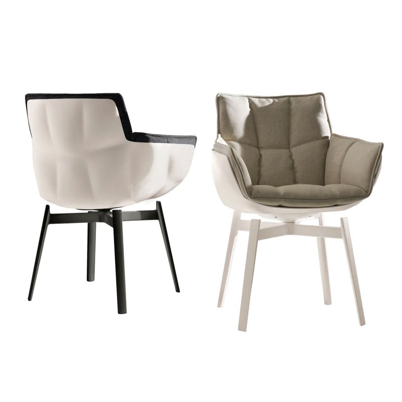 Husk è la sedia di B&B Italia che fa parte dell'omonima collezione disegnata da Patricia Urquiola, che include il mondo degli imbottiti. Nella versione outdoor, Husk è proposta con la scocca che riprende la poltrona originale e il rivestimento disponibile nella gamma dei tessuti B&B Italia. La struttura della gambe è verniciata e disponibile in due colori.