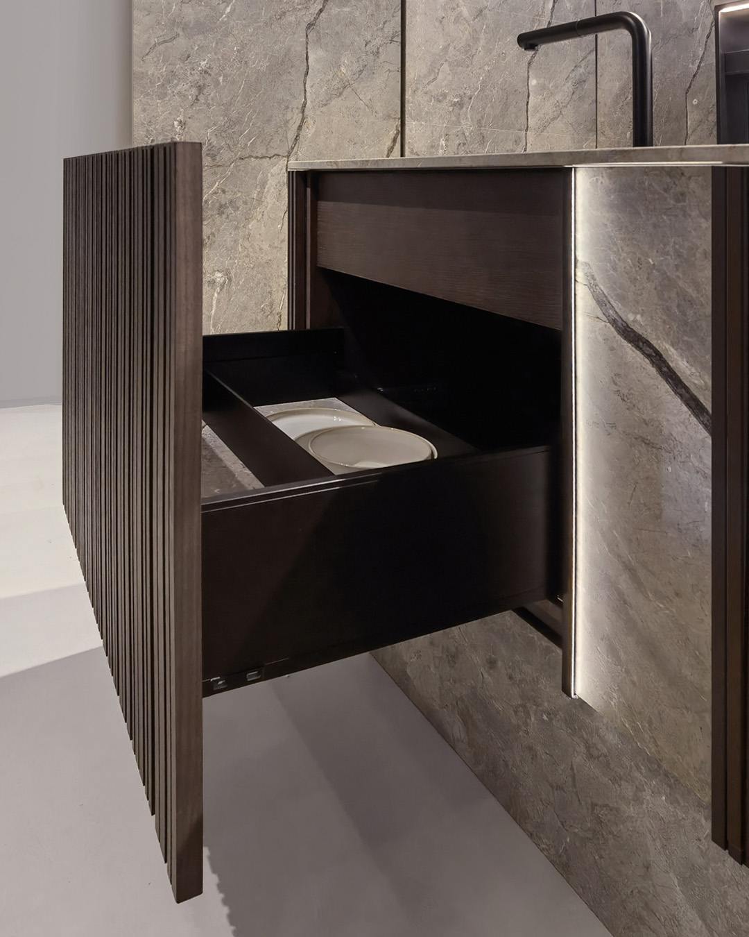 L'approccio "couture" di Modulnova si concretizza in un linguaggio progettuale che ridefinisce la classica volumetria nell'ottica di generare ambienti "fluidi" dove la cucina si combina con la zona living. Un concept di design dove gli ambienti sono interconnessi tra loro, grazie a programmi trasversali.