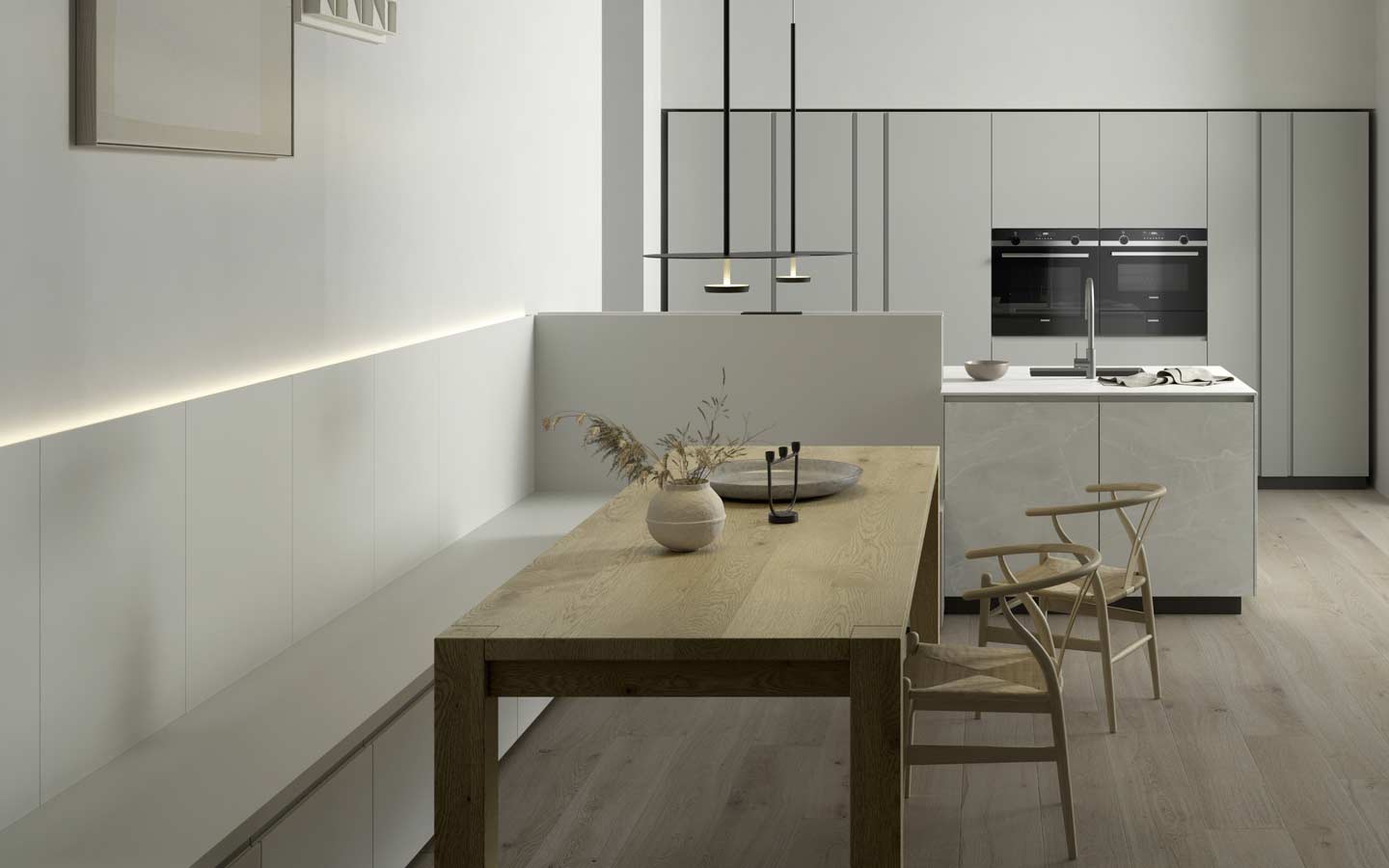 È un micro trend delle cucine 2024 ma ci sembra molto interessante: ci riferiamo alla "panca integrata", una soluzione architettonica in "nicchia" che estende l'estetica della cucina alla zona dining creando un unicum stilistico. Presente nel catalogo di Arclinea e Meson's cucine, la panca è ricavata dall'evoluzione della boiserie che "si stacca" dalla parete diventando seduta.