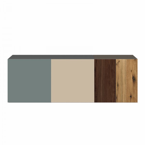 La credenza o madia può essere a terra, con zoccolo, sorretta da piedini classicisostegni in vetro che donano un effetto leggerezza o in metallo "a slitta" o sospesa e composta da: