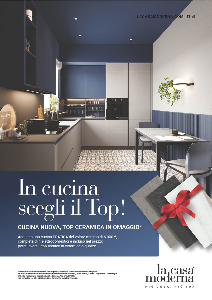 Con l'acquisto di una cucina Pratica de La Casa Moderna nel modello lineare o angolare del valore minimo di 6.000 € completa di 4 elettrodomestici diversi ( piano cottura,  forno,  frigorifero e  lavastoviglie) tutti della stessa marca Electrolux, Whirlpool o Samsung, il top in ceramica o quarzo è in omaggio
