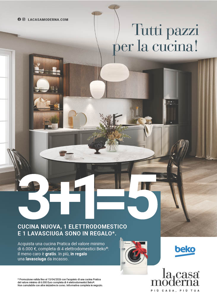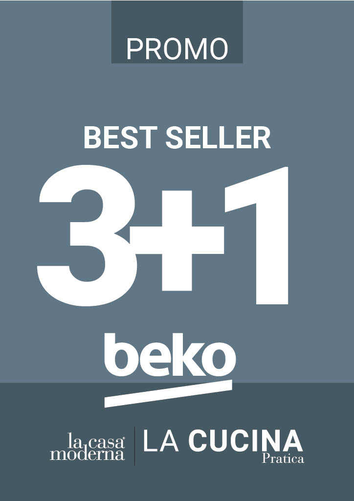 Se acquisti una cucina Pratica del brand La Casa Moderna del valore minimo di 6.000 € e completa di 4 elettrodomestici del marchio Beko puoi usufruire della promozione 3+1=5. L'elettrodomestico meno caro è in omaggio e inoltre riceverai in regalo una lavasciuga da incasso
