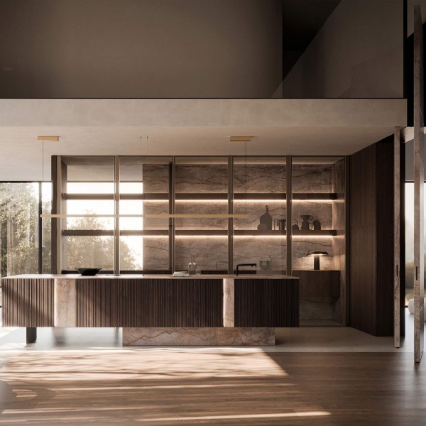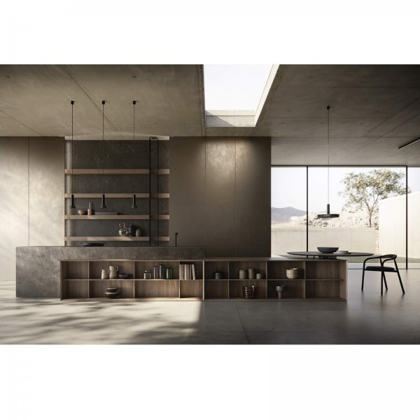 Oltre alla "corrente purista" di concepire le isole nel mono materiale, è rintracciabile un'altra tendenza. Ci riferiamo alla combinazione di più materiali come accade da Modulnova che combina il marmo Silver Roots con il legno di noce nella finitura Moka cannettato in un prezioso gioco di pieni e vuoti. Legno e Pietra avvolgono l’intero volume che poggia su un basamento in pietra e su una doppia lama in metallo.