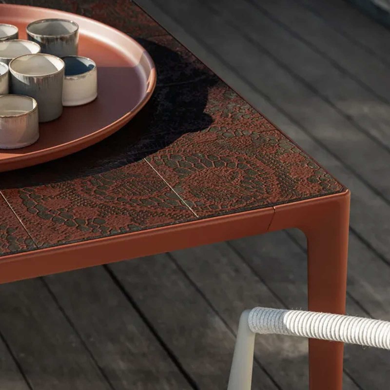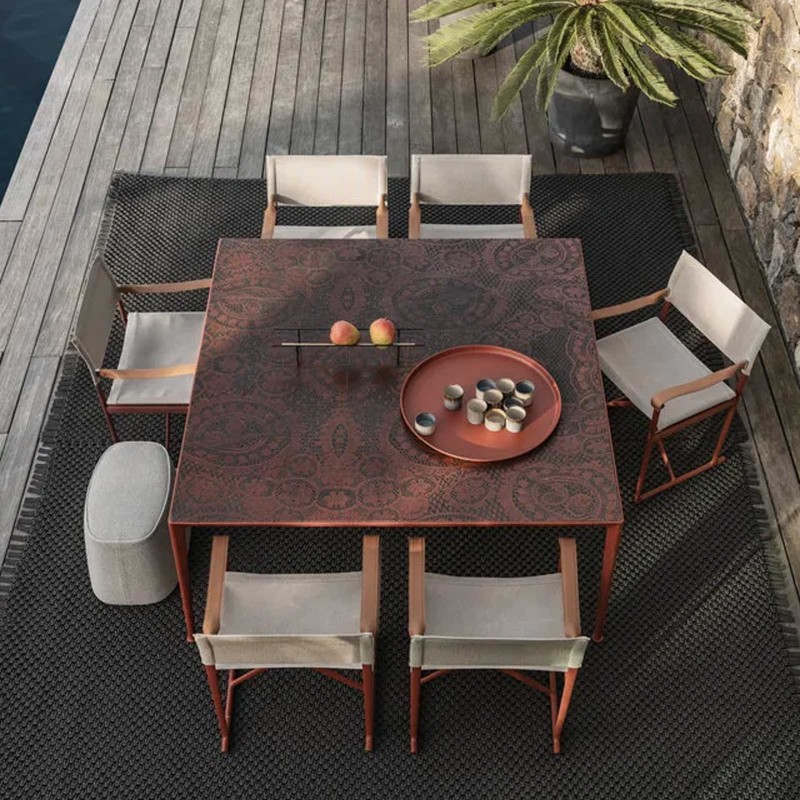 Mirto è il tavolo per esterni progettato da Antonio Citterio per B&B Italia Outdoor. Massima espressione di un design essenziale, Mirto si svela in preziosi dettagli e varie finiture del piano. La struttura è in pressofusione d'alluminio, mentre il top può essere in alluminio verniciato, doghe di Iroko, gres porcellanato, piastrelle in pietra lavica smaltata e decorata con un pizzo siciliano. Lavorazioni speciali per un tavolo outdoor che lascia il segno.