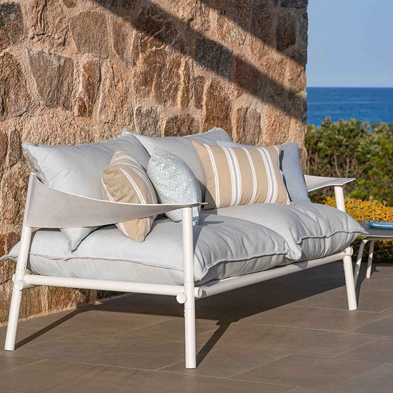 Terramare è la collezione di divani e tavolini firmata dallo Studio Chiaramonte/Marin per Emu, per allestire con colore e raffinatezza gli ambienti living sia indoor che, e soprattutto, outdoor. Due le caratteristiche che identificano e danno personalità a questa serie di mobili. Il primo è il mix innovativo dei materiali: lo schienale è in eco-cuoio con finitura vintage, i piani sono in alluminio o grès, i tessuti colorati sono idrorepellenti e adatti agli ambienti esterni. Il secondo è la linea data ai sistemi di giunzione delle parti che richiamano quelli leggeri dei tronchi dei giunchi. Completa la tua area living con una poltrona e un tavolo da caffè della stessa serie per ospitare i tuoi amici!