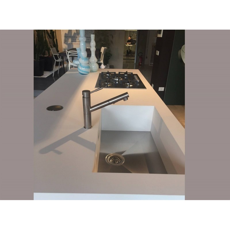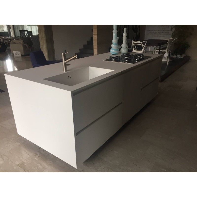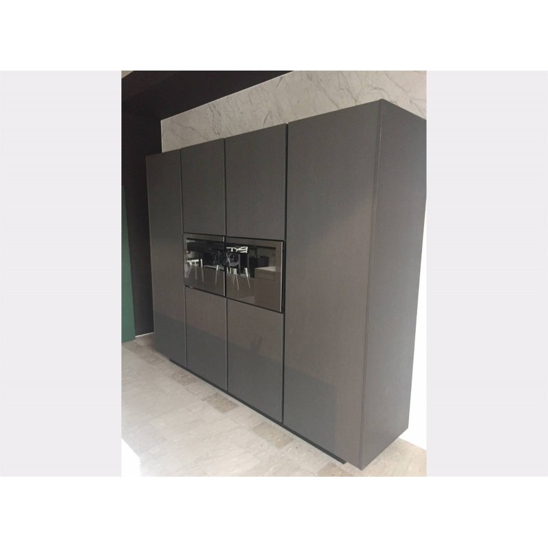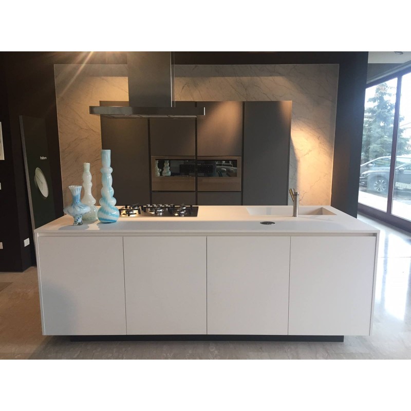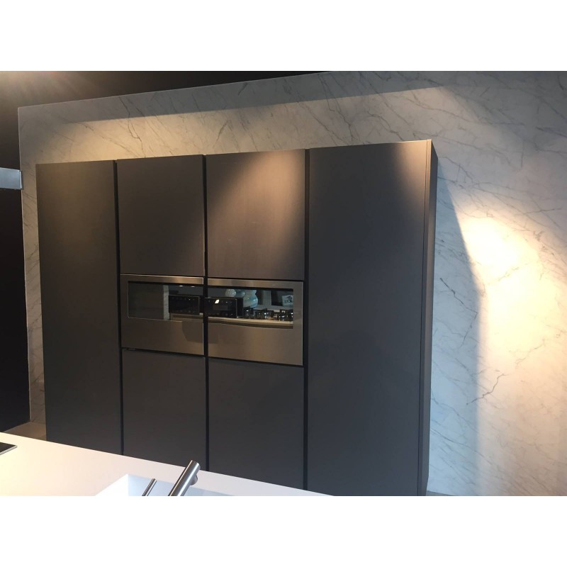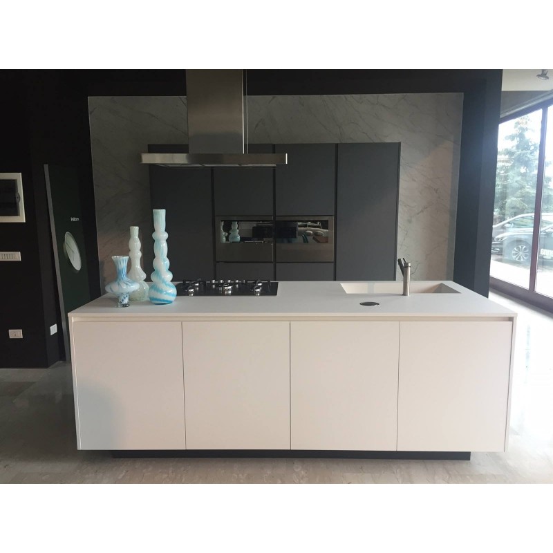 Isola bianco laminato touch hpl, colonne effetto metallo Silk Grey, piano laminato tuttocolore bianco, zoccoli Moka. Dimensioni isola 244 x 104 cm, Colonne da 249 cm altezza 215 cm. Completa di elettrodomestici con frigo, lavastoviglie e piano cottura Electrolux, cappa Franke, doppio forno microonde/ventilato, miscelatore Franke.