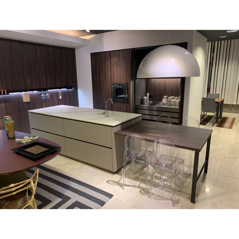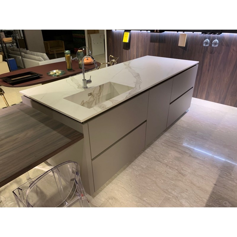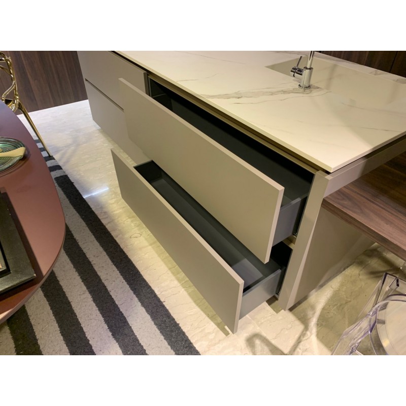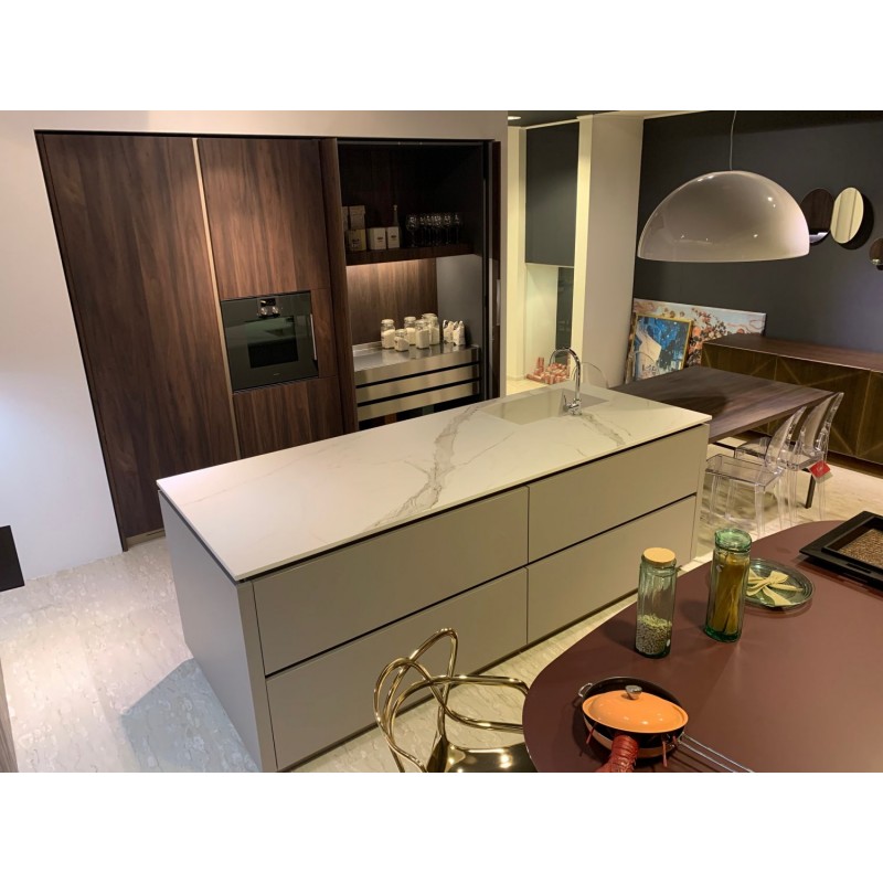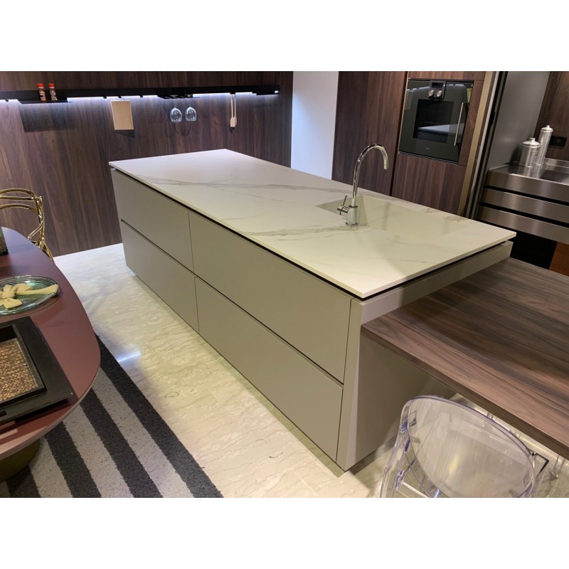 Cucina ad isola mod. Trim di Meson's, in offerta per rinnovo expo, con fianchi e frontali laccato canapa, gole e zoccoli alluminio champagne, piano in ceramica / gres porcellanato Laminam calacatta, con lavello e piano cottura integrati, tavolo snack in essenza noce, come colonne.