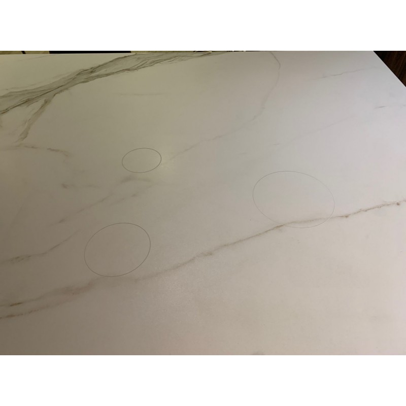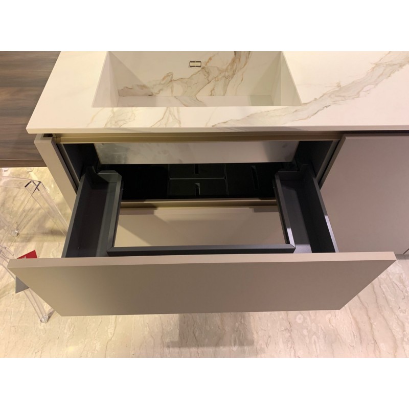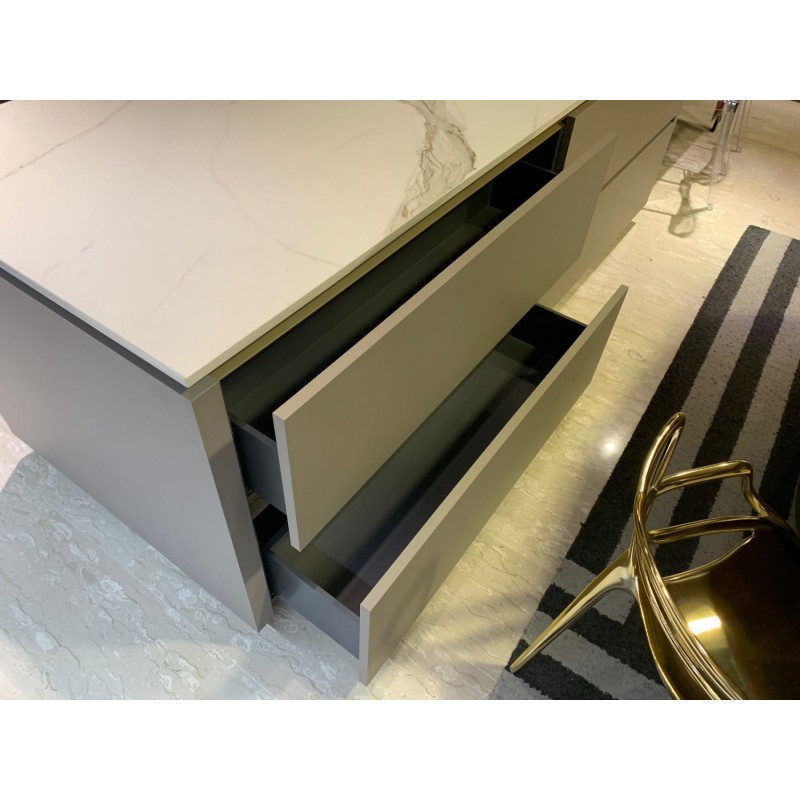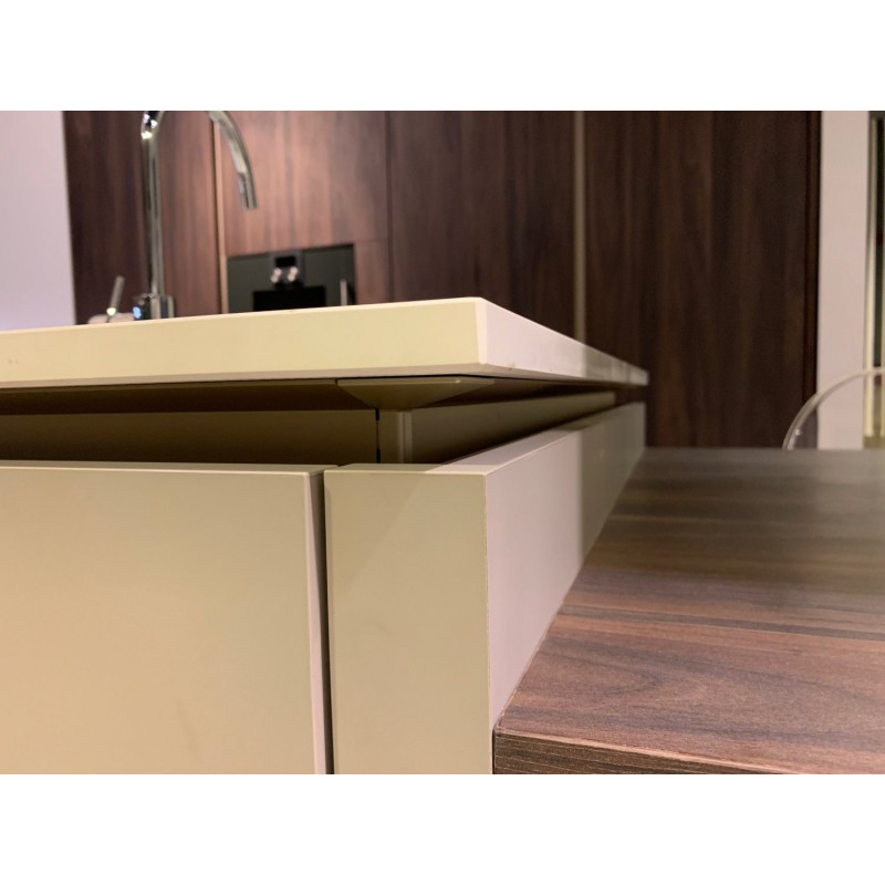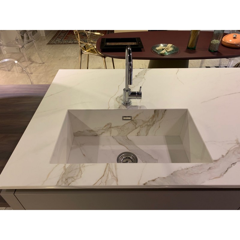 Cucina ad isola mod. Trim di Meson's, in offerta per rinnovo expo, con fianchi e frontali laccato canapa, gole e zoccoli alluminio champagne, piano in ceramica / gres porcellanato Laminam calacatta, con lavello e piano cottura integrati, tavolo snack in essenza noce, come colonne.