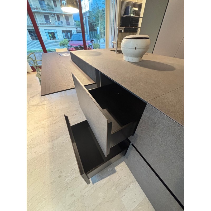 La cucina MH6 Fly di Modulnova è un mix di modelli del brand, dove l'isola Fly si contraddistingue per il taglio a 45° dell'anta, con uno scenografico effetto monolite.