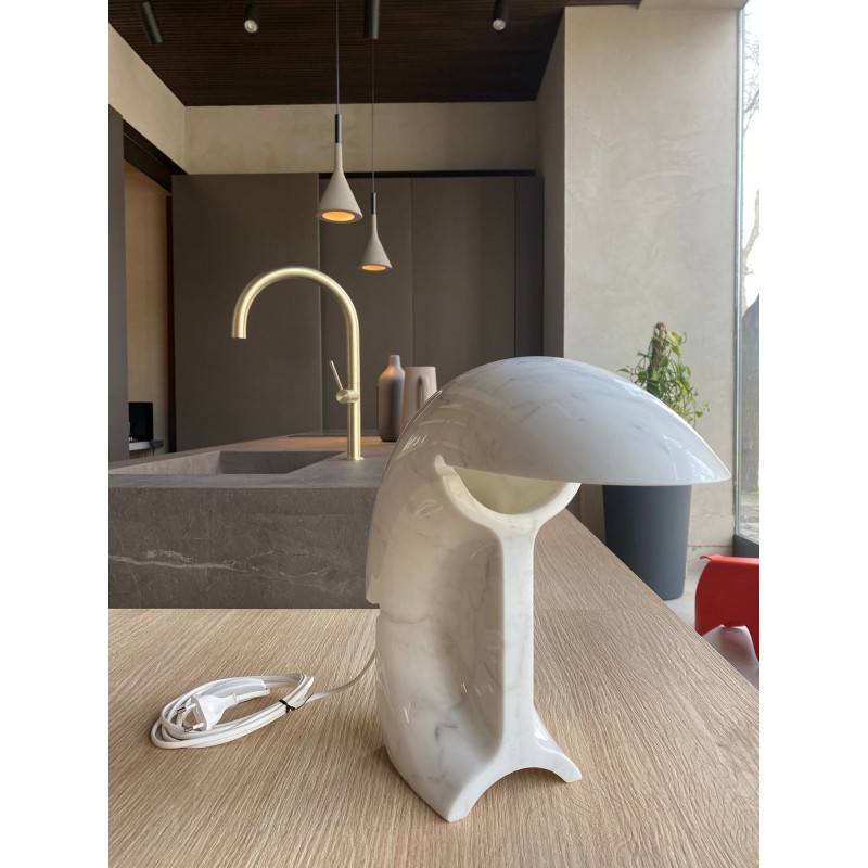 Biagio di Flos è la lampada ideata da Tobia Scarpa nel 1968, ancora oggi un progetto celebre apprezzato per la sua estetica scultorea. Biagio è una lampada da tavolo a luce diretta ricavata da un unico blocco scolpito di marmo bianco statuario di Carrara. La superficie liscia e chiara riflette la luce naturale e si illumina da accesa, evidenziando le venature uniche del materiale naturale.