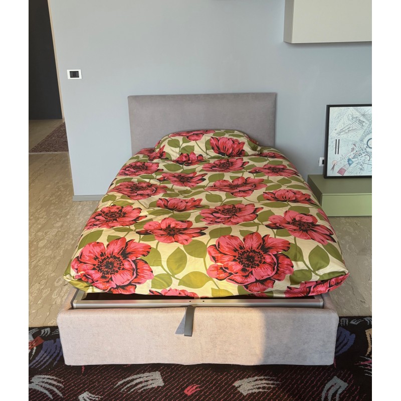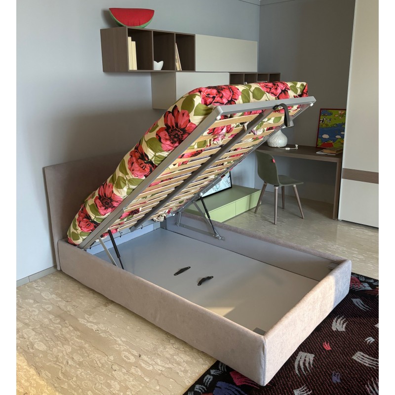 Il letto ad una piazza e mezza Plain di Samoa a prezzo outlet in esposizione nel nostro showroom di Sassoferrato ha testiera e giroletto rivestiti, contenitore con alzarete pivot frontale ed è così proposto: