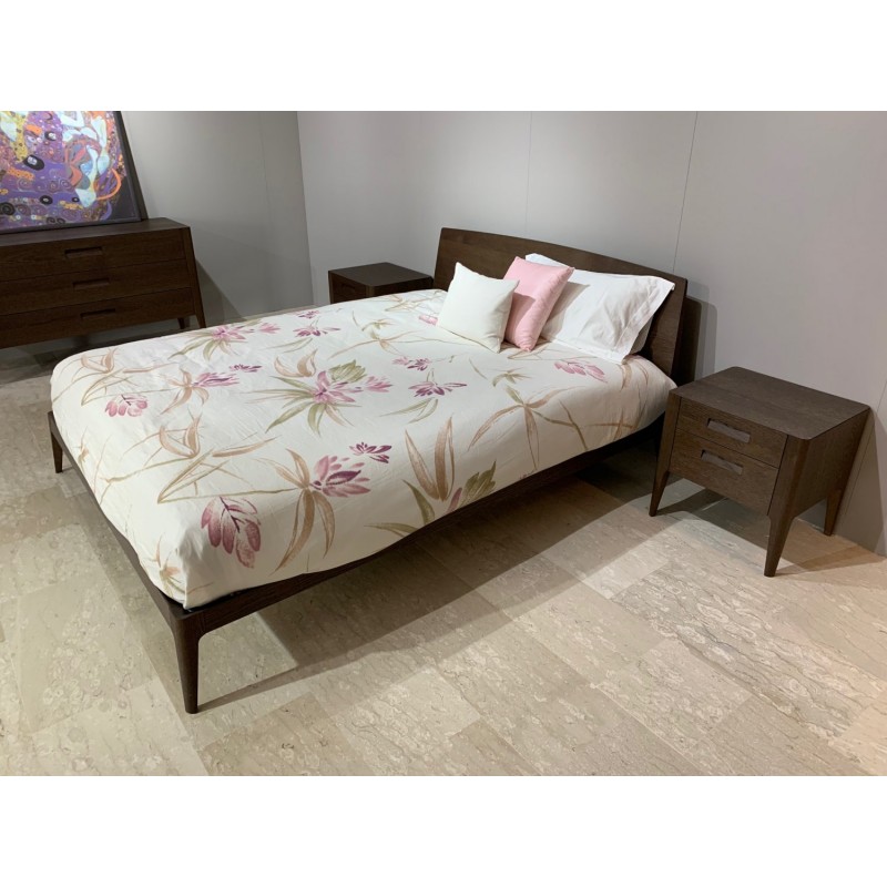 Il letto Siri di Novamobili si contraddistingue per linee gentili e arrotondate ed è proposto a prezzo outlet per rinnovo expo nella configurazione impiallacciato rovere terra.