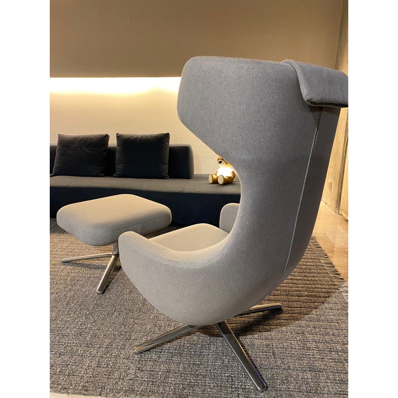 La versione disponibile è realizzata con tessuto Mello 10 Grigio Ciottolo, la base a quattro razze è in alluminio pressofuso lucido e i pattini 05 con feltro sono ideali per pavimenti duri. La leva di comando del meccanismo è coordinata con il basamento.