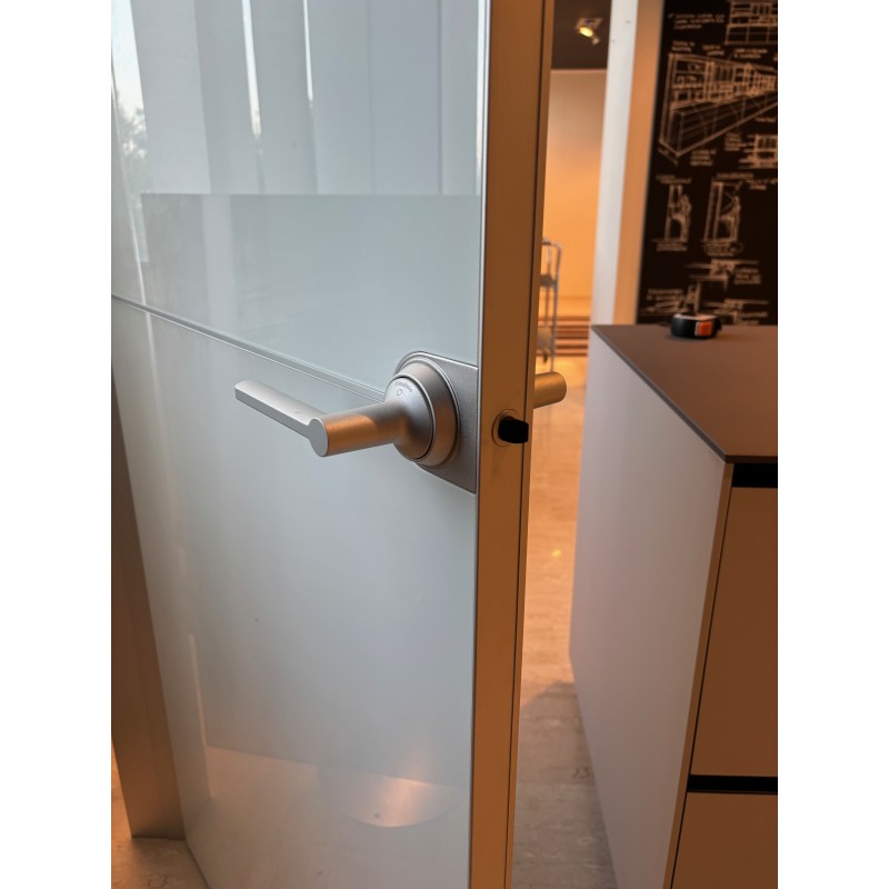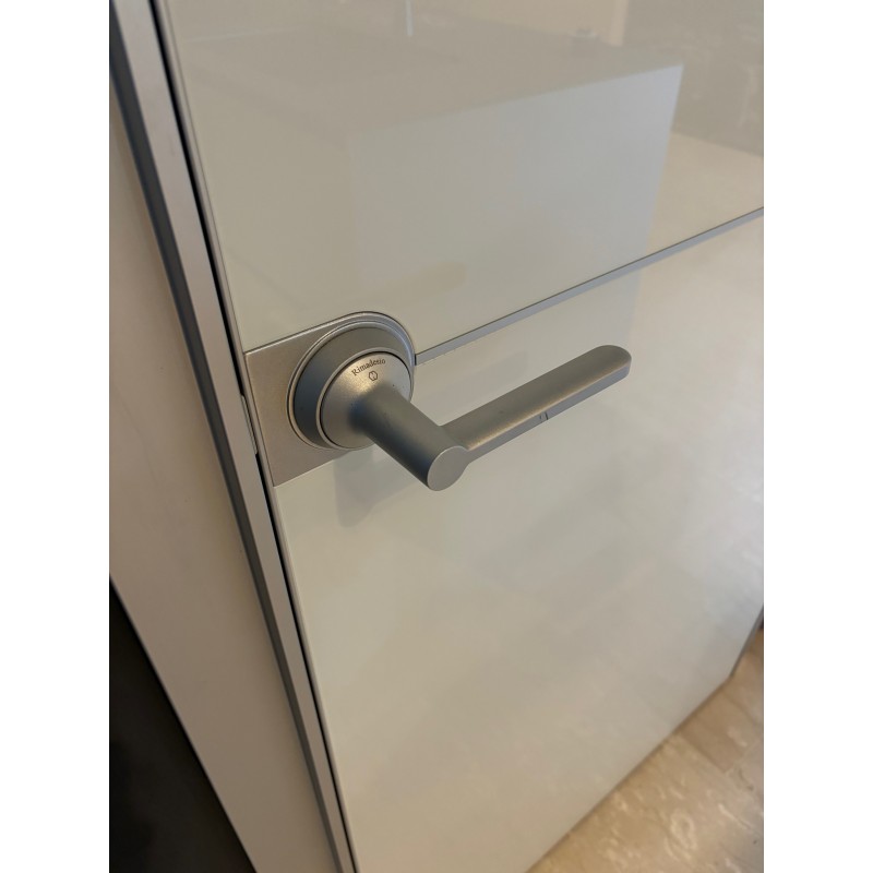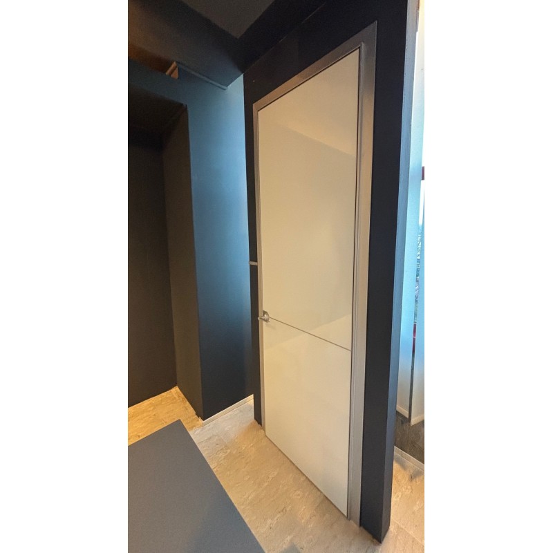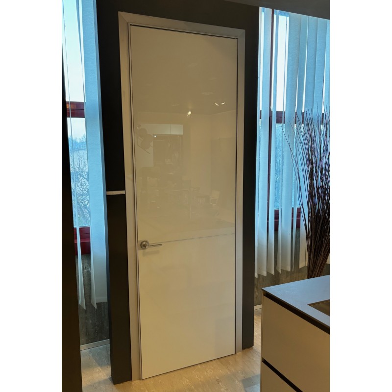 Plana di Rimadesio design Giuseppe Bavuso è una porta battente minimale caratterizzata dal telaio in alluminio e dal frontale della porta in vetro lucido bianco con profili e maniglia inox. Disponibile in pronta consegna a prezzo outlet per rinnovo expo: