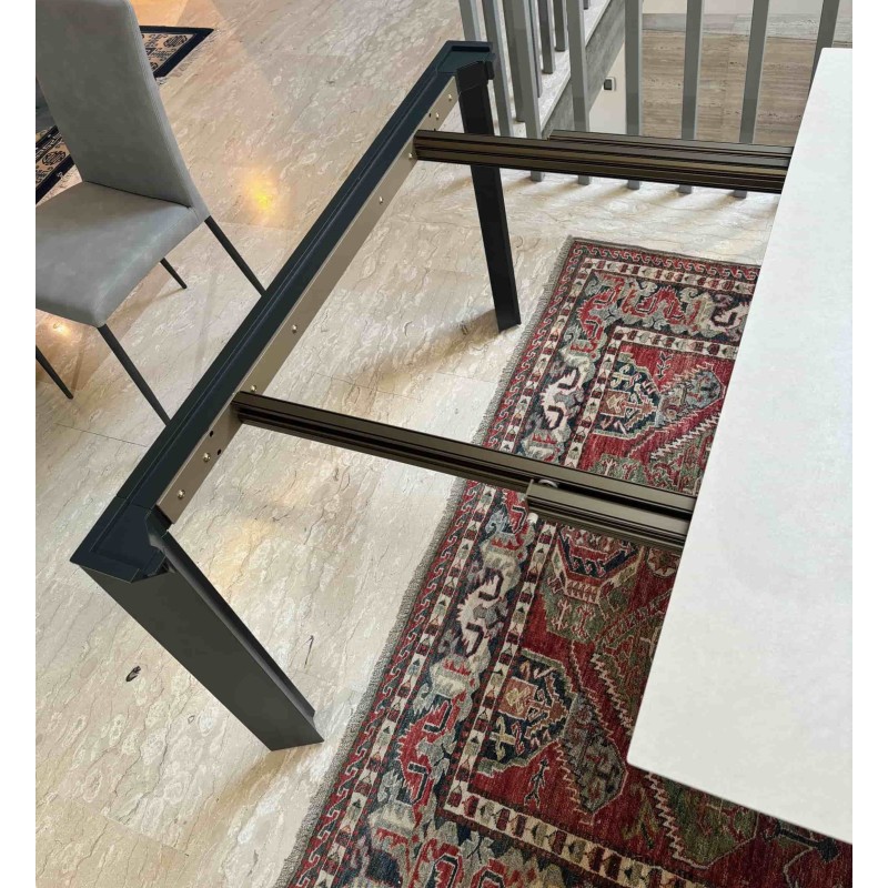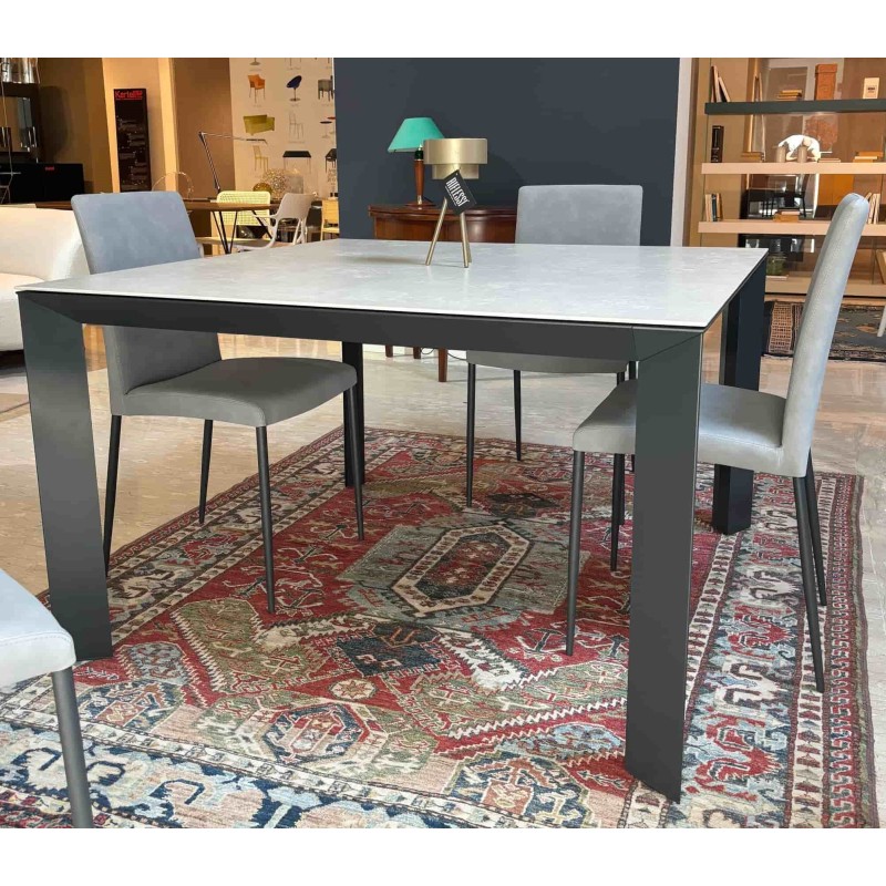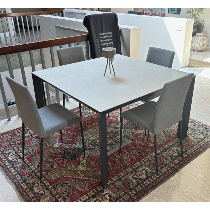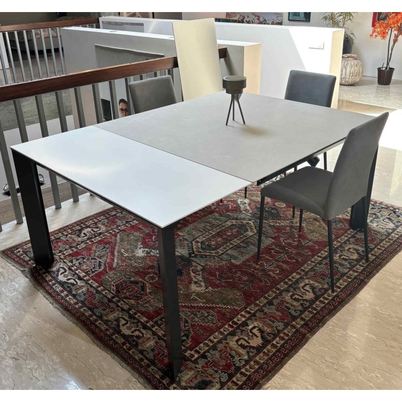Il tavolo Manhattan di Riflessi ha linee essenziali e si adatta perfettamente a diversi stili d'arredamento. In questa versione a prezzo outlet per rinnovo d'esposizione, Manhattan è proposto nella forma quadrata allungabile e con il piano in ceramica: