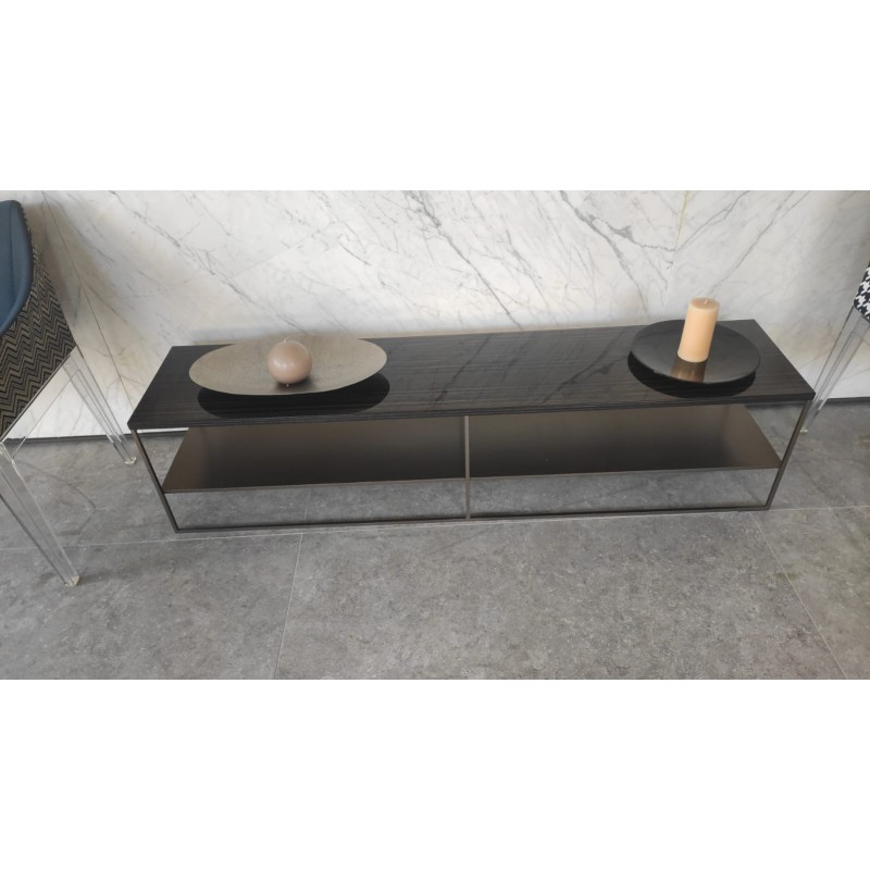 Calder Bronze Side Table di Minotti è un tavolino di servizio dalla struttura in metallo e dal piano in essenza, disponibile in stock a prezzo outlet per rinnovo expo nella seguente configurazione: